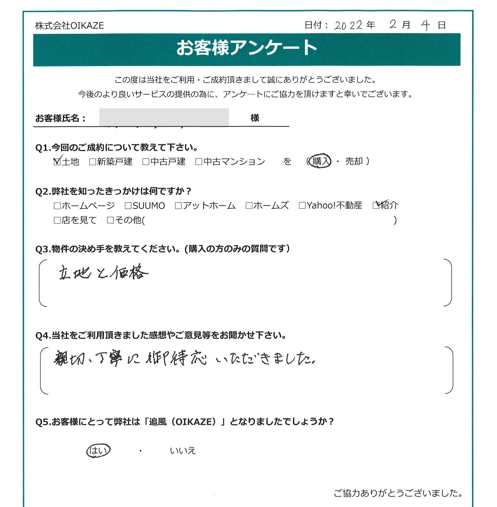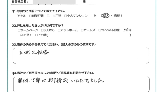 【2021年12月ご成約】埼玉県ふじみ野市の土地をご購入の㈱K様2022.07.08土地, 渡辺健太 埼玉県ふじみ野市の土地ご購入の㈱K様 ff587ddbdf1a176bd0cf61d7ece94d68 今回のご成約について教えてください。土地を購入。弊社を知ったきっかけは何ですか?紹介。物件の決め手を教えてください立地と価格。当社をご利用頂きました感想やご意見等をお聞かせ下さい親切・丁寧にご対応いただきました。お客様にとって弊社は「追風(OIKAZE)」となりましたでしょうか?はい。