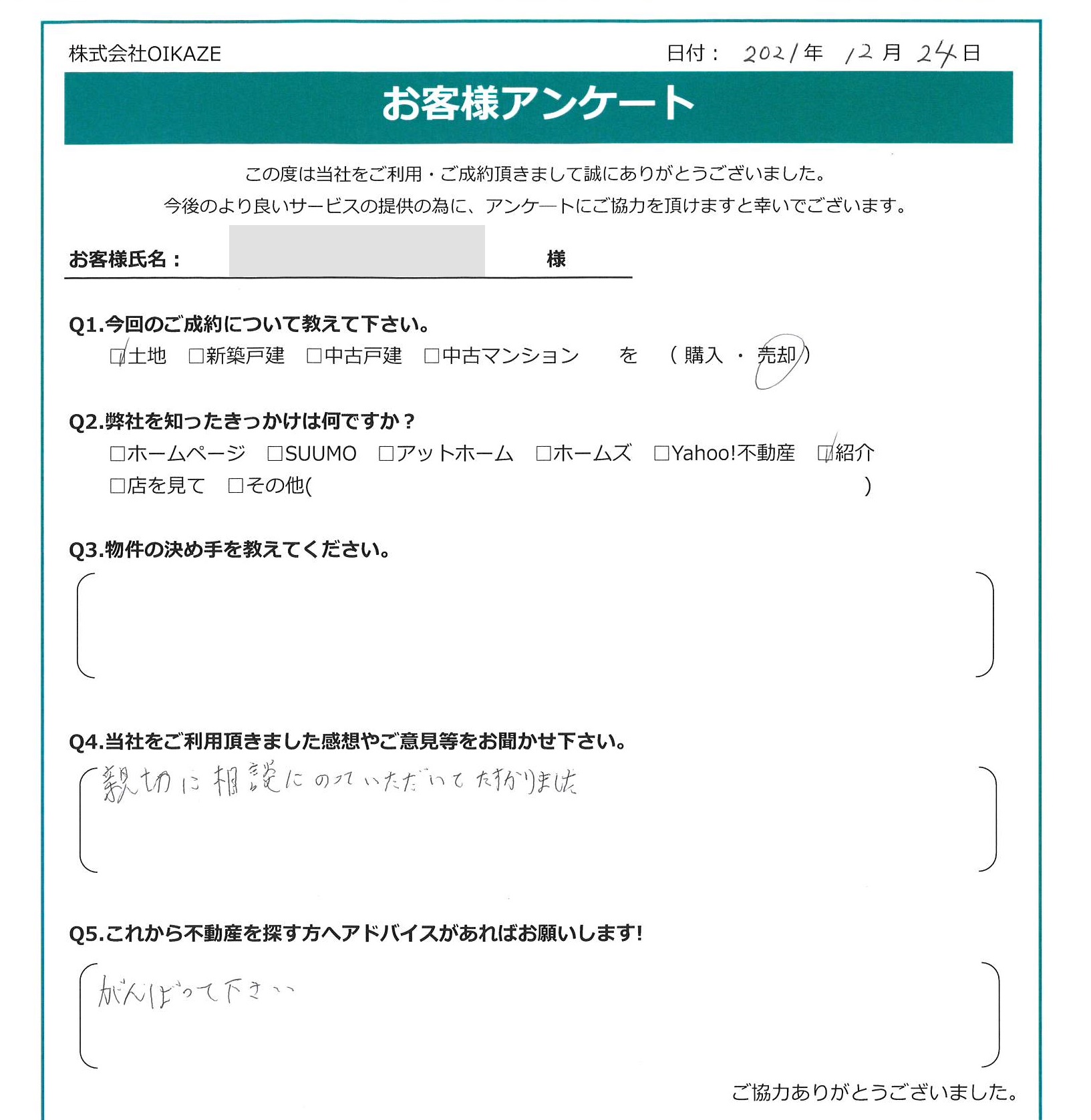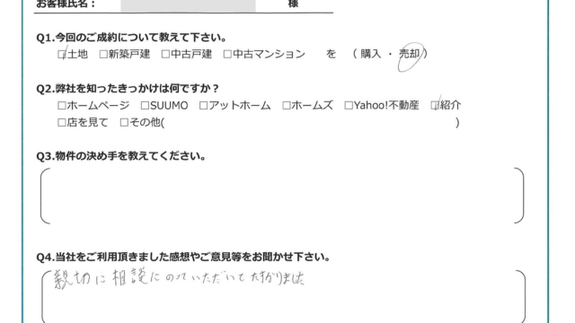 【2021年12月ご成約】埼玉県ふじみ野市の土地をご売却のS様2022.07.08土地, 渡辺健太 埼玉県ふじみ野市土地ご売却のS様 4bbb468f80111deef7a66d50ca213368 今回のご成約について教えてください。土地を売却。弊社を知ったきっかけは何ですか?紹介。当社をご利用頂きました感想やご意見等をお聞かせ下さい。親切に相談にのって頂いて助かりました。これから不動産を探す方へアドバイスがあればお願いします!がんばってください。