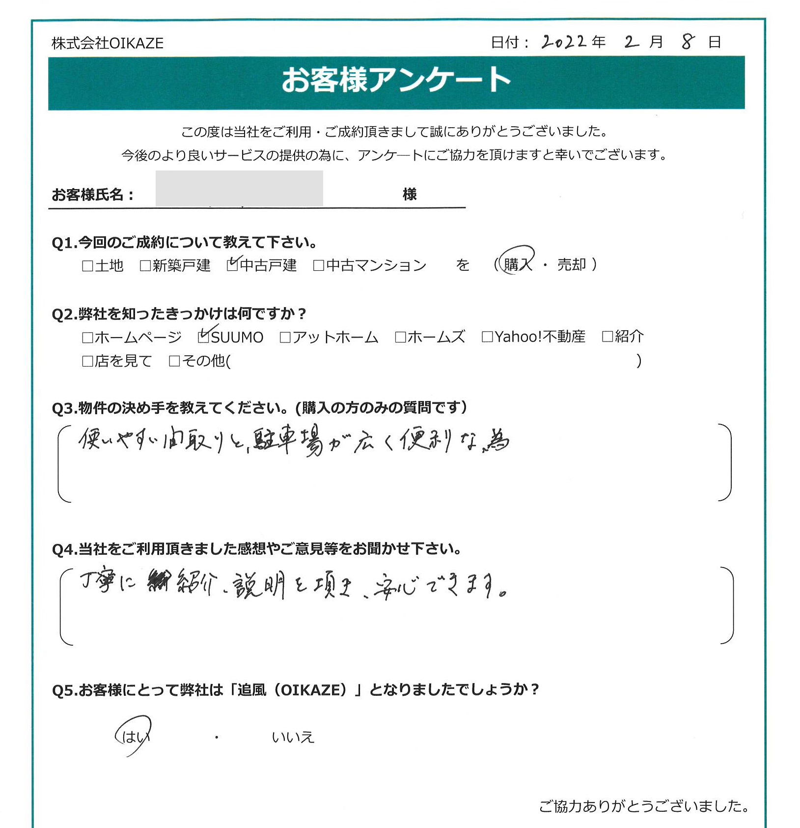 【2022年2月ご成約】埼玉県川越市の中古戸建ご購入のM様 2022.07.13中古戸建, 渡辺健太 2022年2月/埼玉県川越市/中古戸建ご購入のM様 お客様から頂いたアンケート 今回のご成約について教えてください。 中古戸建を購入。 弊社を知ったきっかけは何ですか? SUUMO。 物件の決め手を教えてください。 使いやすい間取りと、駐車場が広く便利な為。 当社をご利用頂きました感想やご意見等をお聞かせ下さい。 丁寧に紹介・説明を頂き、安心できます。 お客様にとって弊社は「追風(OIKAZE)」となりましたでしょうか? はい。 担当はこんな人!
