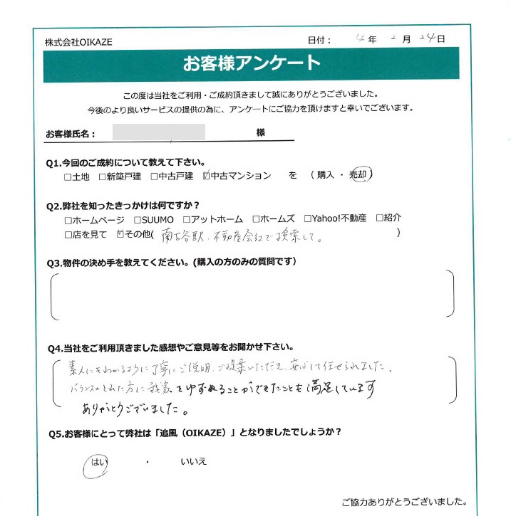 【2022年2月ご成約】埼玉県川越市の中古マンションをご売却のT様 2022.07.15中古マンション, 渡辺健太 埼玉県川越市の中古マンションご売却のT様 お客様から頂いたアンケート 今回のご成約について教えてください 中古マンションを売却。 弊社を知ったきっかけは何ですか? 南古谷駅、不動産会社で検索して。 当社をご利用頂きました感想やご意見等をお聞かせ下さい 素人にも分かる様に丁寧にご説明ご提案いただき、安心して任せられました。バランスのとれた方に我が家を譲れることが出来たことも満足しています。ありがとうございました。 お客様にとって弊社は「追風(OIKAZE)」となりましたでしょうか? はい。 担当はこんな人!
