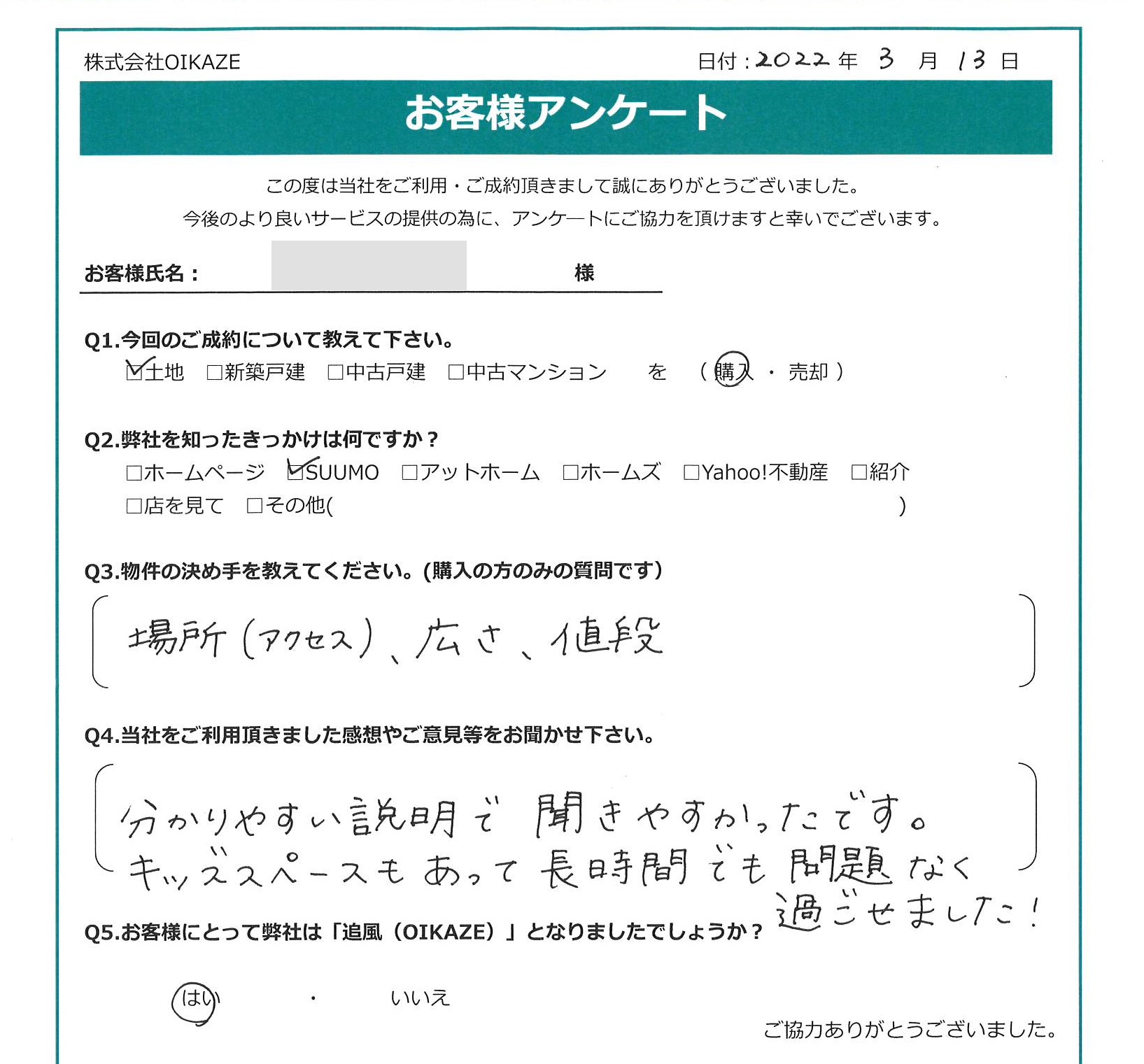 【2022年3月ご成約】埼玉県ふじみ野市の土地をご購入のT様 2022.07.16土地, 渡辺健太 埼玉県ふじみ野市の土地ご購入のT様 お客様から頂いたアンケート 今回のご成約について教えてください。 土地を購入。 弊社を知ったきっかけは何ですか? SUUMO。 物件の決め手を教えてください。 場所(アクセス)、広さ、値段。 当社をご利用頂きました感想やご意見等をお聞かせ下さい 分かりやすい説明で聞きやすかったです。キッズスペースもあって長時間でも問題なく過ごせました! お客様にとって弊社は「追風(OIKAZE)」となりましたでしょうか? はい。 担当はこんな人!