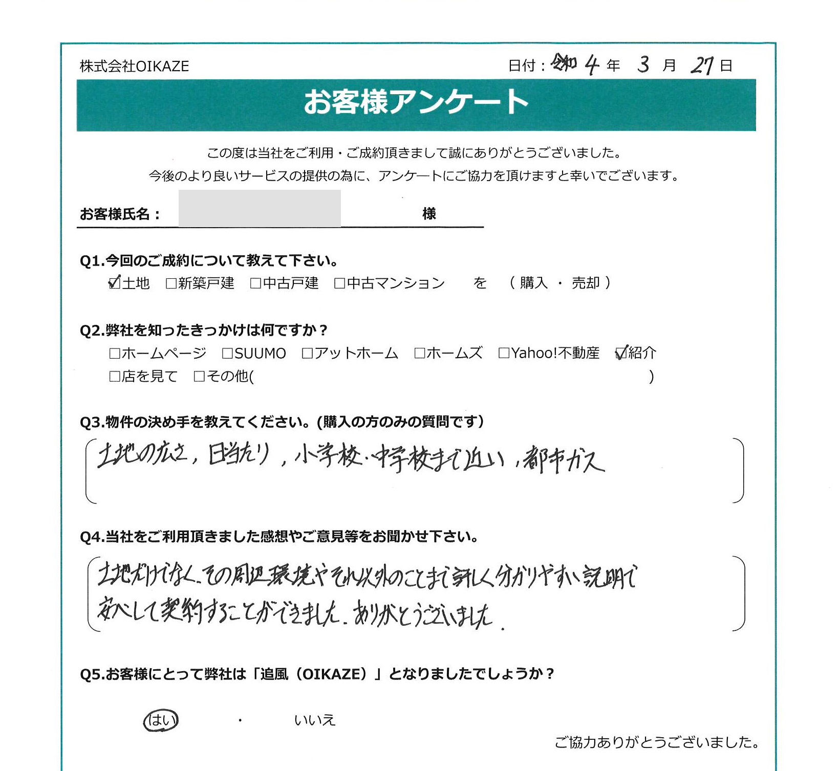 【2022年3月ご成約】埼玉県川越市の土地をご購入のS様 2022.07.16土地, 渡辺健太 埼玉県川越市の土地ご購入のS様 お客様から頂いたアンケート 今回のご成約について教えてください。 土地を購入。 弊社を知ったきっかけは何ですか? 紹介。 物件の決め手を教えてください。 土地の広さ、陽当たり、小学校・中学校まで近い、都市ガス。 当社をご利用頂きました感想やご意見等をお聞かせ下さい。 土地だけでなく、その周辺環境やそれ以外のことまで詳しく分かりやすい説明で安心して契約することができました、ありがとうございました。 お客様にとって弊社は「追風(OIKAZE)」となりましたでしょうか? はい。 担当はこんな人!