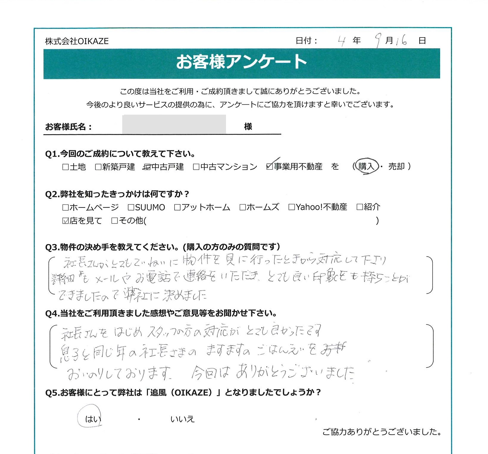 社長さんがとても丁寧に、物件を見に行った時から対応して下さり、詳細もメールやお電話で連絡を頂き、