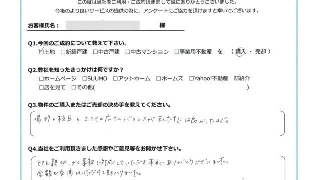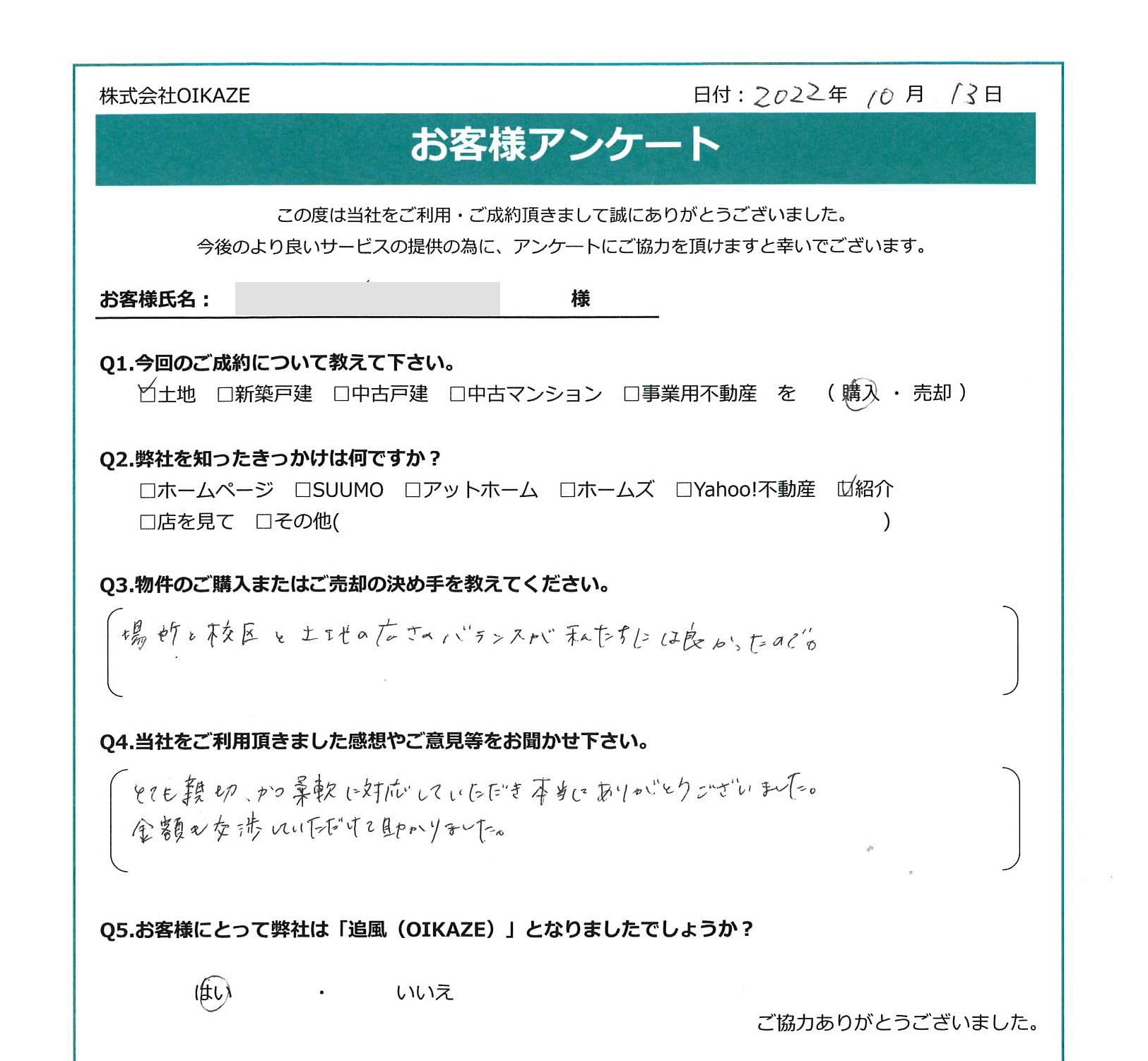 【2022年10月ご成約】埼玉県川越市の土地をご購入のY様 2022.10.13土地, 渡辺健太 【2022年10月ご成約】埼玉県川越市の土地をご購入のY様 21e523d6deb6722088580ac1113c3706 今回のご成約について教えて下さい。 土地を購入。 弊社を知ったきっかけは何ですか? 紹介。 物件のご購入またはご売却の決め手を教えてください。 場所と校区と土地の広さのバランスが私たちには良かったので。 当社をご利用頂きました感想やご意見等をお聞かせ下さい。 とても親切、かつ柔軟に対応して頂き本当にありがとうございました。 金額も交渉していただけて助かりました。 お客様にとって弊社は「追風(OIKAZE)」となりましたでしょうか? はい。 担当はこんな人!