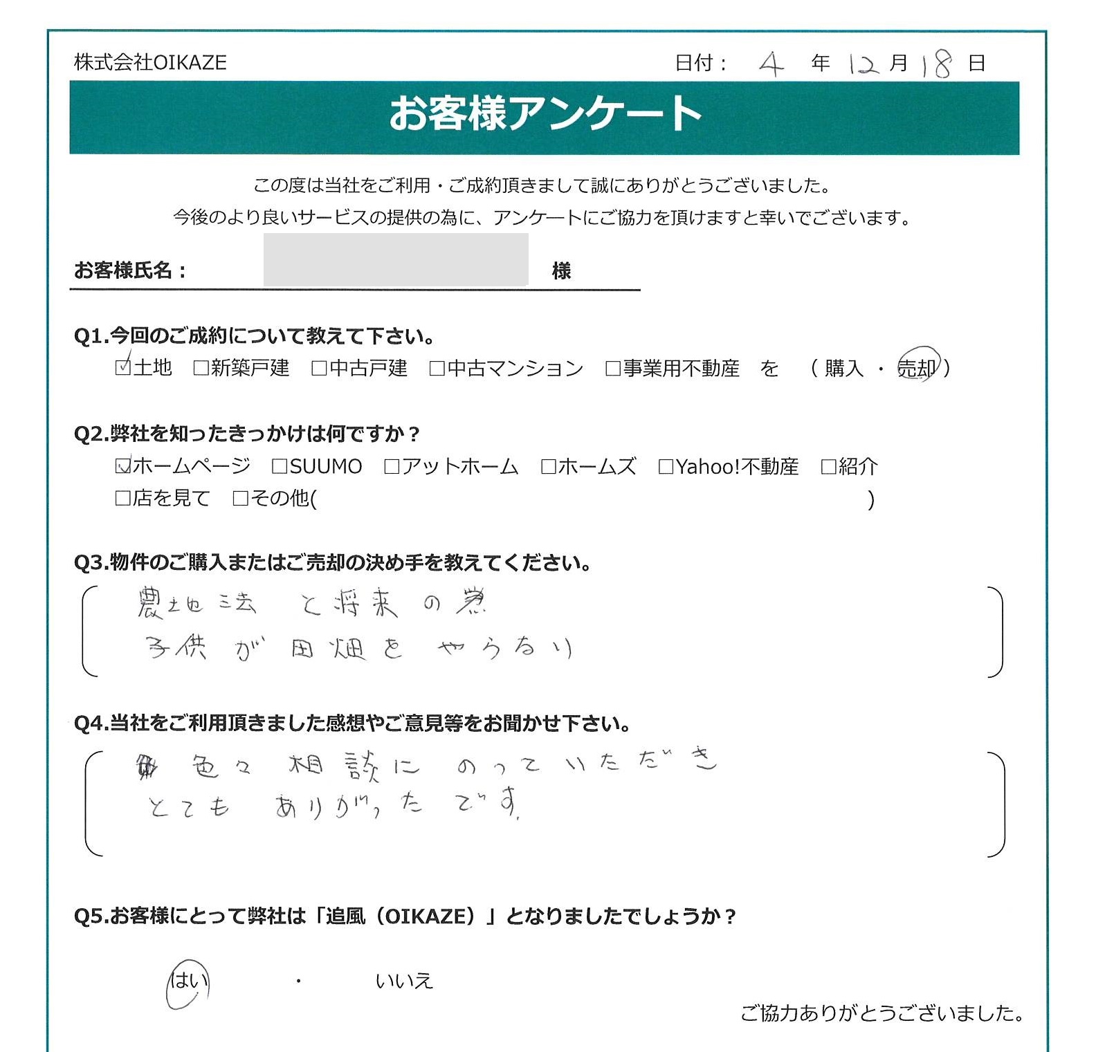 【2022年12月ご成約】埼玉県富士見市の土地をご売却のK様2022.12.18土地 【2022年12月ご成約】埼玉県富士見市の土地をご売却のK様 お客様から頂いたアンケート 今回のご成約について教えてください。土地を売却。弊社を知ったきっかけは何ですか?ホームページ。物件のご売却の決め手を教えて下さい。農地法と将来の為。子供が田畑をやらまい。当社をご利用頂きました感想やご意見等をお聞かせください。色々相談にのっていただきとてもありがたかったです。お客様にとって弊社は「追風(OIKAZE)」となりましたでしょうか?はい。