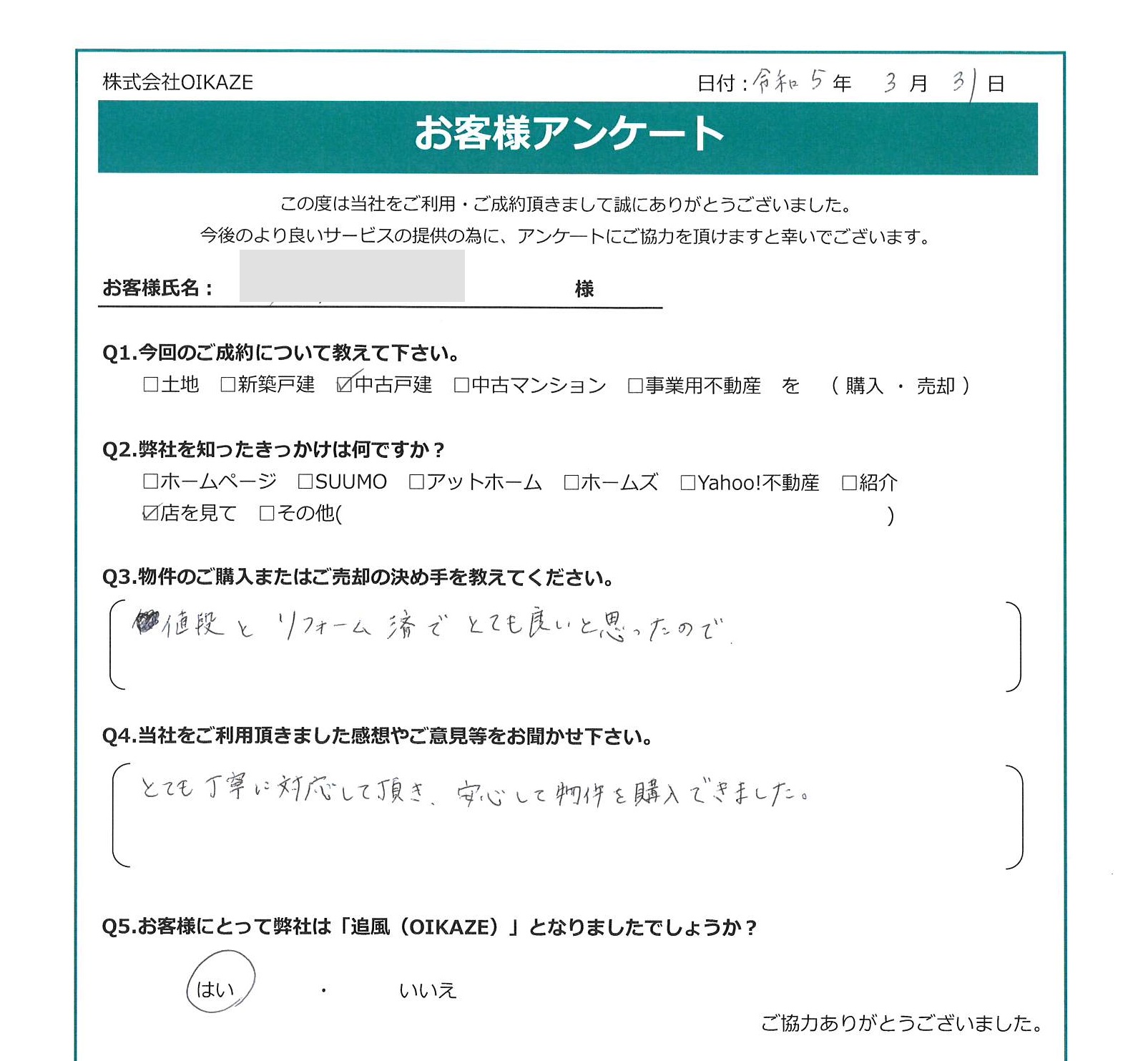 【2023年3月ご成約】埼玉県川越市の中古戸建をご購入のY様 2023.04.01中古戸建, 渡辺健太 【2023年3月ご成約】埼玉県川越市の中古戸建をご購入のY様 お客様から頂いたアンケート 今回のご成約について教えてください。 中古戸建を購入。 弊社を知ったきっかけは何ですか? 店を見て。 物件のご購入の決め手を教えて下さい。 値段とリフォーム済でとても良いと思ったので。 当社をご利用頂きました感想やご意見等をお聞かせください。 とても丁寧に対応して頂き、安心して物件を購入できました。 お客様にとって弊社は「追風(OIKAZE)」となりましたでしょうか? はい。