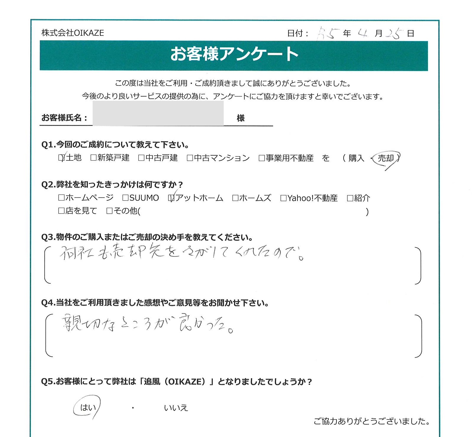 【2023年4月ご成約】埼玉県川越市の土地をご売却のS様2023.04.27土地, 渡辺健太 【2023年4月ご成約】埼玉県川越市の土地をご売却のS様 お客様から頂いたアンケート 今回のご成約について教えてください。土地を売却。弊社を知ったきっかけは何ですか?アットホーム。物件のご売却の決め手を教えて下さい。何社も売却先をさがしてくれたので。当社をご利用頂きました感想やご意見等をお聞かせください。親切なところが良かった。お客様にとって弊社は「追風(OIKAZE)」となりましたでしょうか?はい。