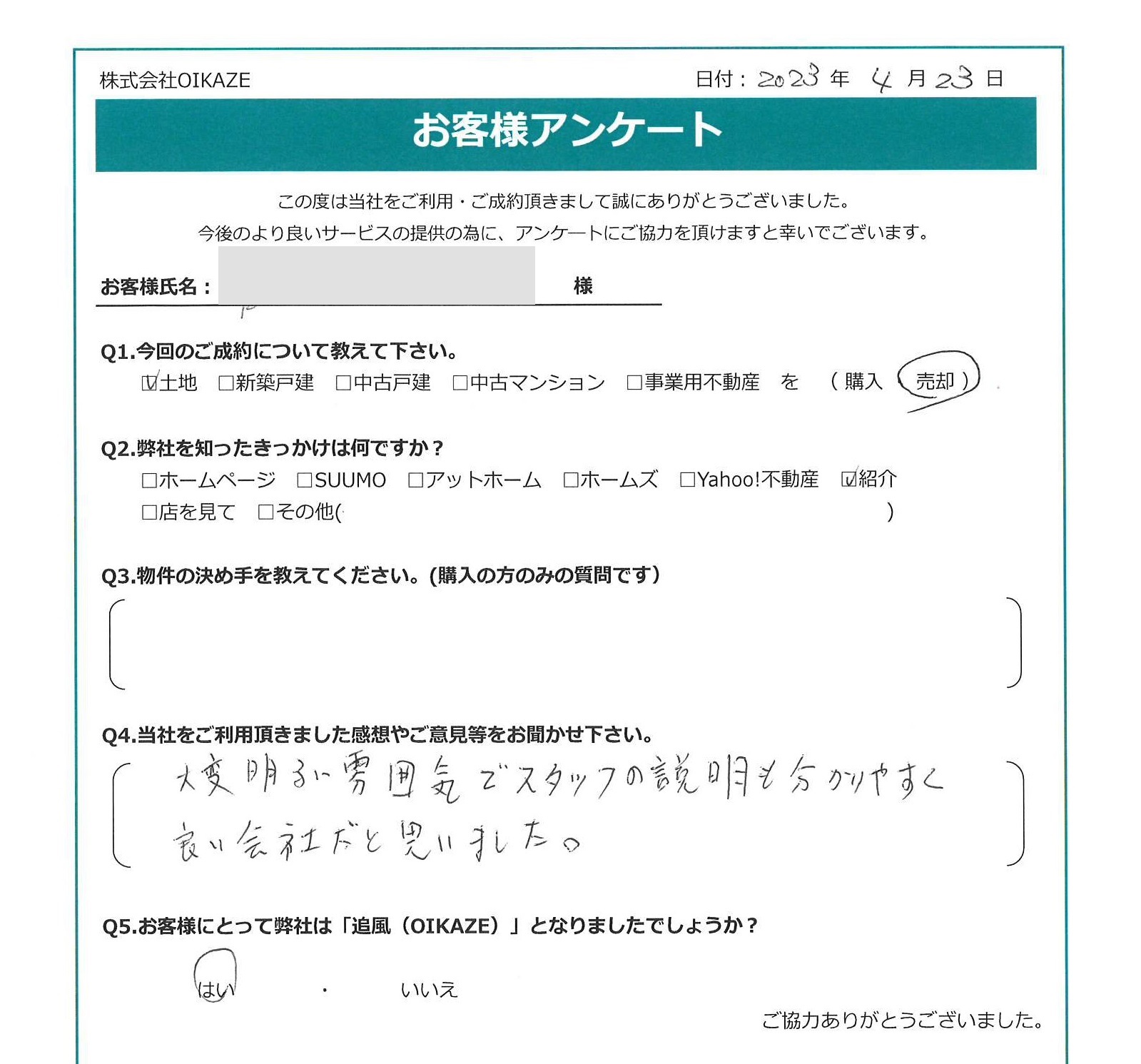 【2023年4月ご成約】埼玉県川越市の土地をご売却のT様 2023.04.23土地 【2023年4月ご成約】埼玉県川越市の土地をご売却のT様 お客様から頂いたアンケート 今回のご成約について教えてください 土地を売却。 弊社を知ったきっかけは何ですか? 紹介。 当社をご利用頂きました感想やご意見等をお聞かせください。 大変明るい雰囲気でスタッフの説明も分かりやすく良い会社だと思いました。 お客様にとって弊社は「追風(OIKAZE)」となりましたでしょうか? はい。