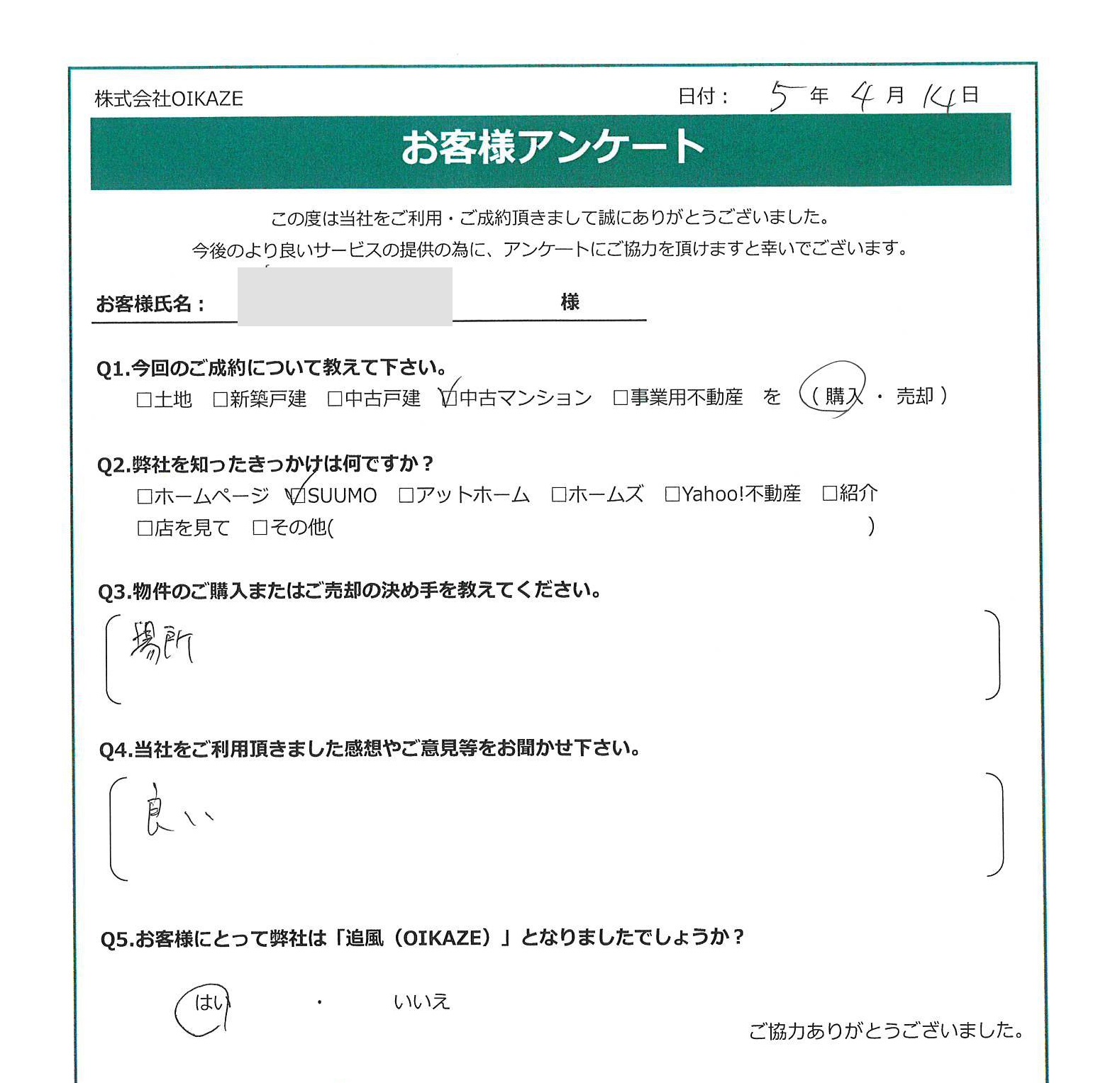 【2023年4月ご成約】埼玉県川越市の中古マンションをご購入のO様2023.04.23中古マンション, 渡辺健太 お客様から頂いたアンケート 今回のご成約について教えてください中古マンションを購入。弊社を知ったきっかけは何ですか?SUUMO。物件のご購入の決め手を教えて下さい。場所。当社をご利用頂きました感想やご意見等をお聞かせください。良い。お客様にとって弊社は「追風(OIKAZE)」となりましたでしょうか?はい。