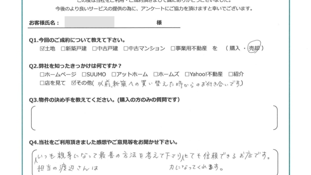 【2023年6月ご成約】埼玉県所沢市の土地をご売却のN様2023.06.16土地, 渡辺健太 【2023年6月ご成約】埼玉県川越市の土地をご売却のN様 お客様アンケート 今回のご成約について教えて下さい。土地を売却。弊社を知ったきっかけは何ですか?以前、新築へ買い替えた時からのお付き合いです。当社をご利用頂きました感想やご意見等をお聞かせ下さい。担当の渡辺さんは、いつも親身になって最善の方法を考えて下さり力になってくれます。 とても信頼できるお店です。お客様にとって弊社は「追風(OIKAZE)」となりましたでしょうか?はい。