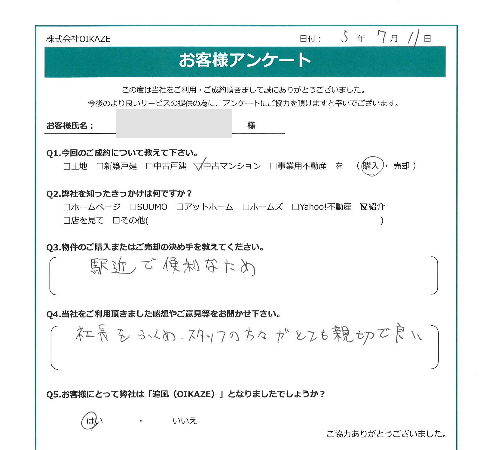 【2023年7月ご成約】埼玉県川越市の中古マンションをご購入のS様 2023.07.11中古マンション, 渡辺健太 【2023年7月ご成約】埼玉県川越市の中古マンションをご購入のS様 お客様から頂いたアンケート 今回のご成約について教えてください。中古マンションを購入。弊社を知ったきっかけは何ですか?紹介。物件のご購入の決め手を教えて下さい。駅近で便利なため。当社をご利用頂きました感想やご意見等をお聞かせください。社長を含め、スタッフの方々がとても親切で良い。お客様にとって弊社は「追風(OIKAZE)」となりましたでしょうか?はい。