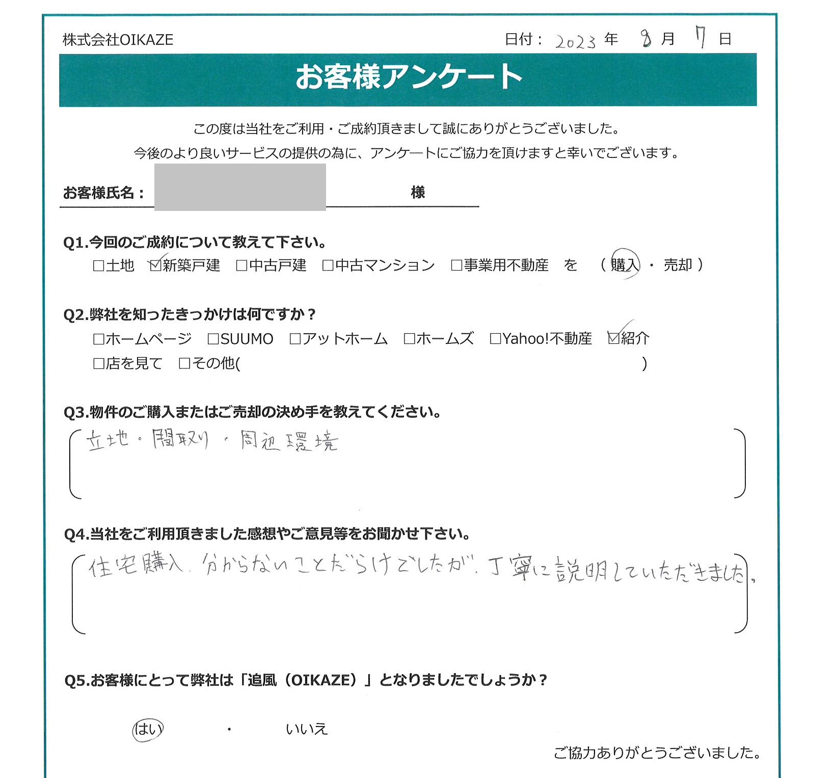 【2023年8月ご成約】神奈川県海老名市の新築戸建をご購入のH様 2023.08.07新築戸建, 渡辺健太 【2023年8月ご成約】神奈川県海老名市の新築戸建をご購入のH様 お客様から頂いたアンケート 今回のご成約について教えてください。 新築戸建を購入。 弊社を知ったきっかけは何ですか? 紹介。 物件のご購入の決め手を教えて下さい。 立地・間取り・周辺環境 当社をご利用頂きました感想やご意見等をお聞かせください。 住宅購入、分からないことだらけでしたが、丁寧に説明していただきました。 お客様にとって弊社は「追風(OIKAZE)」となりましたでしょうか? はい。