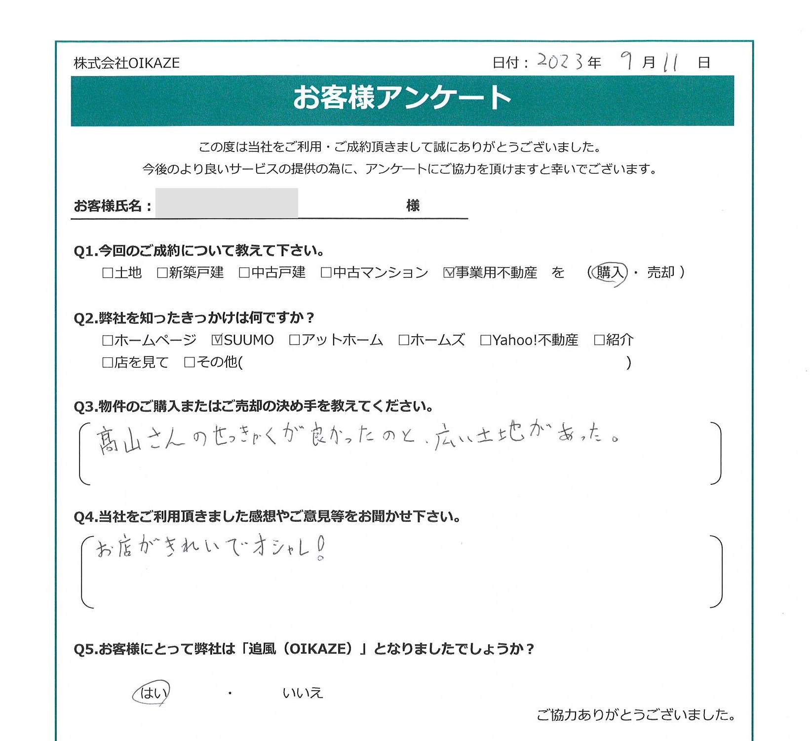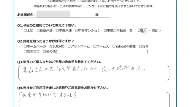 【2023年9月ご成約】埼玉県富士見市の事業用不動産(工場)をご購入の㈱S様 2023.09.12事業用不動産 【2023年9月ご成約】埼玉県富士見市の事業用不動産をご売却のY様 お客様から頂いたアンケート 今回のご成約について教えて下さい。事業用不動産(工場)を購入弊社を知ったきっかけは何ですか?SUUMO物件のご購入の決め手を教えてください。髙山さんの接客が良かったのと、広い土地があった。当社をご利用頂きました感想やご意見等をお聞かせ下さい。お店がきれいでオシャレ!お客様にとって弊社は「追風(OIKAZE)」となりましたでしょうか?はい。