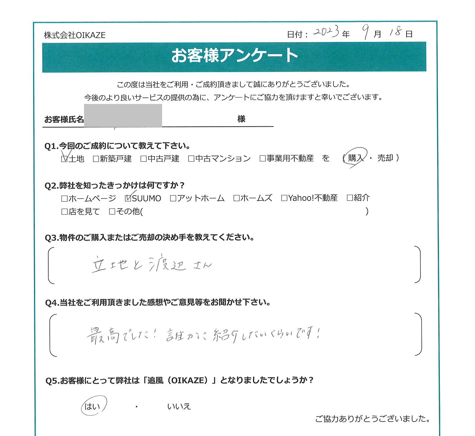 【2023年9月ご成約】埼玉県川越市の土地をご購入のF様 2023.09.18土地, 渡辺健太 【2023年9月ご成約】埼玉県川越市の土地をご購入のF様 お客様から頂いたアンケート 今回のご成約について教えてください。土地を購入。弊社を知ったきっかけは何ですか?SUUMO。物件のご購入の決め手を教えて下さい。立地と渡辺さん。当社をご利用頂きました感想やご意見等をお聞かせください。最高でした!誰かに紹介したいくらいです!お客様にとって弊社は「追風(OIKAZE)」となりましたでしょうか?はい。
