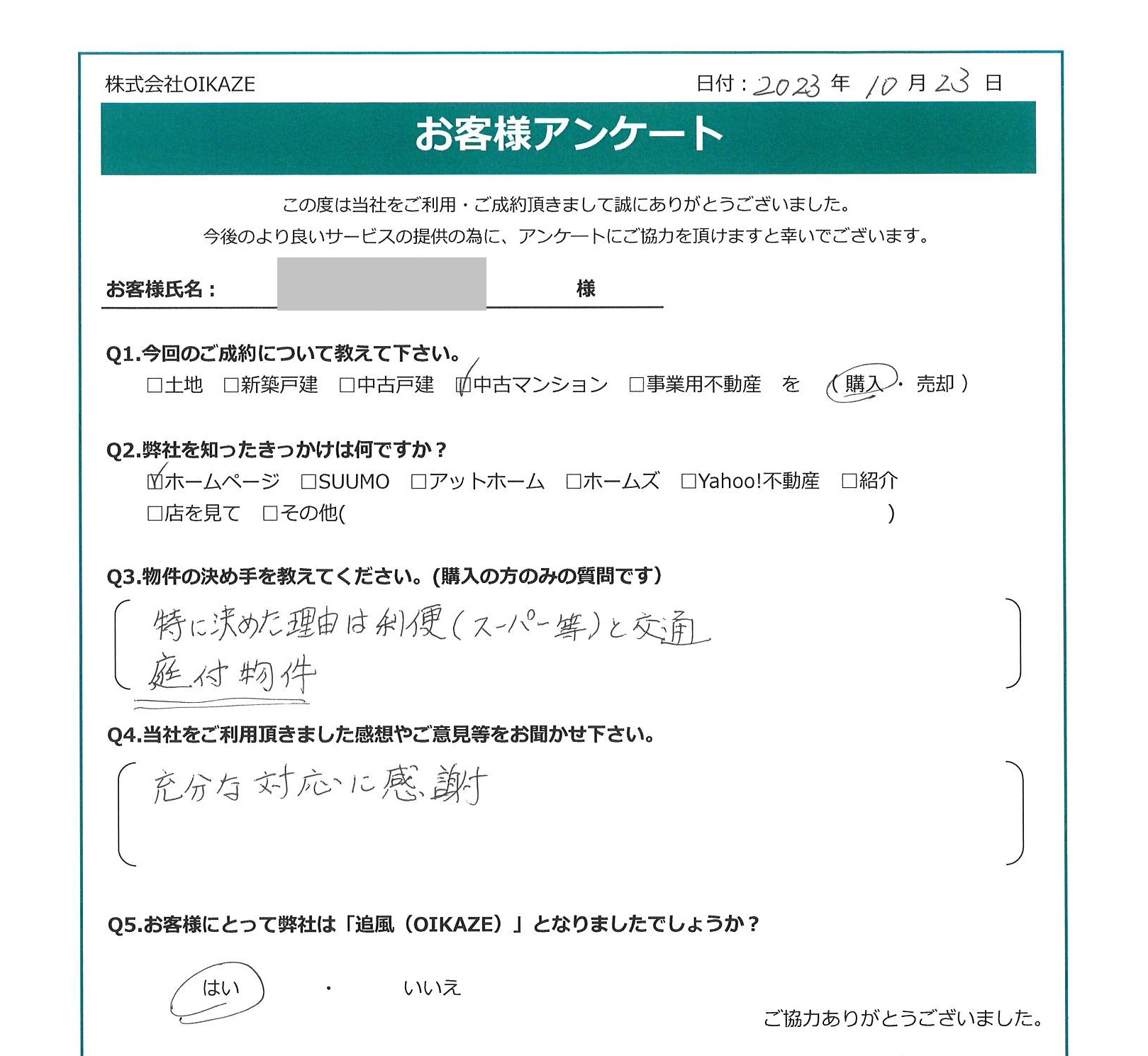 【2023年10月ご成約】埼玉県川越市の中古マンションをご購入のH様 2023.10.23中古マンション 【2023年10月ご成約】埼玉県川越市の中古マンションをご購入のH様 お客様から頂いたアンケート 今回のご成約について教えてください。中古マンションを購入。弊社を知ったきっかけは何ですか?ホームページ。物件のご購入の決め手を教えて下さい。特に決めた理由は利便(スーパー等)と交通。庭付物件当社をご利用頂きました感想やご意見等をお聞かせください。充分な対応に感謝。お客様にとって弊社は「追風(OIKAZE)」となりましたでしょうか?はい。