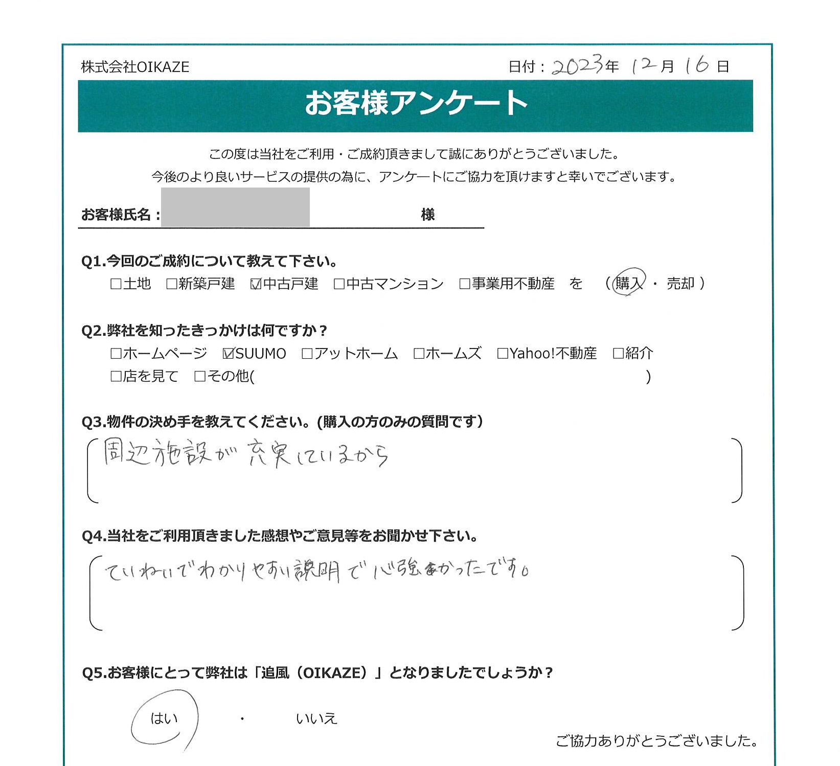 【2023年12月ご成約】埼玉県ふじみ野市の中古戸建をご購入のN様 2023.12.16中古戸建 【2023年12月ご成約】埼玉県ふじみ野市の中古戸建をご購入のN様 お客様から頂いたアンケート 今回のご成約について教えてください。 中古戸建を購入。 弊社を知ったきっかけは何ですか? SUUMO。 物件のご売却の決め手を教えて下さい。 周辺施設が充実しているから。 当社をご利用頂きました感想やご意見等をお聞かせください。 ていねいでわかりやすい説明で心強かったです。 お客様にとって弊社は「追風(OIKAZE)」となりましたでしょうか? はい。