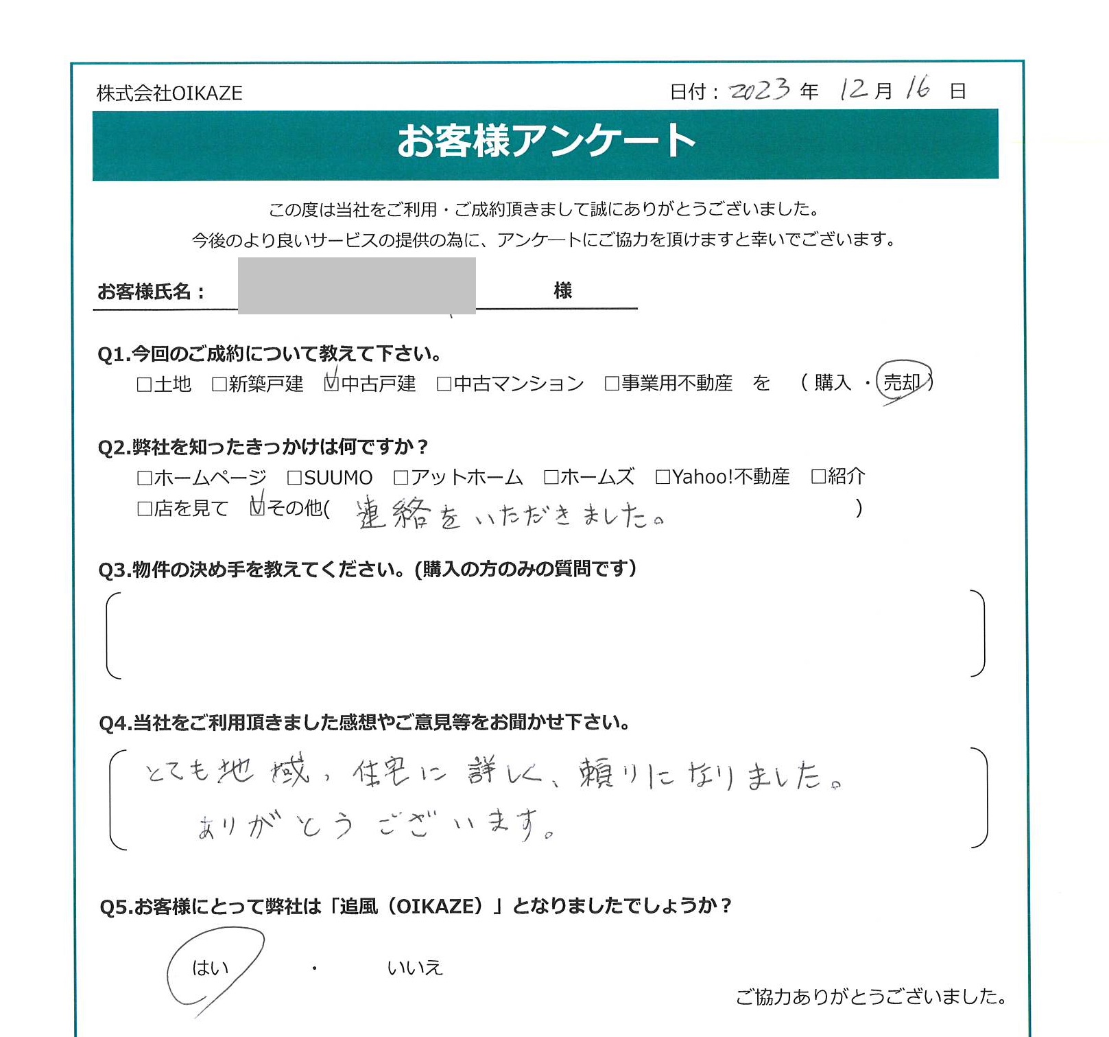【2023年12月ご成約】埼玉県ふじみ野市の中古戸建をご売却のY様 2023.12.16中古戸建 【2023年12月ご成約】埼玉県ふじみ野市の中古戸建をご売却のY様 お客様から頂いたアンケート 今回のご成約について教えてください。 中古戸建を売却。 弊社を知ったきっかけは何ですか? 連絡をいただきました。 当社をご利用頂きました感想やご意見等をお聞かせください。 とても地域、住宅に詳しく、頼りになりました。ありがとうございます。 お客様にとって弊社は「追風(OIKAZE)」となりましたでしょうか? はい。