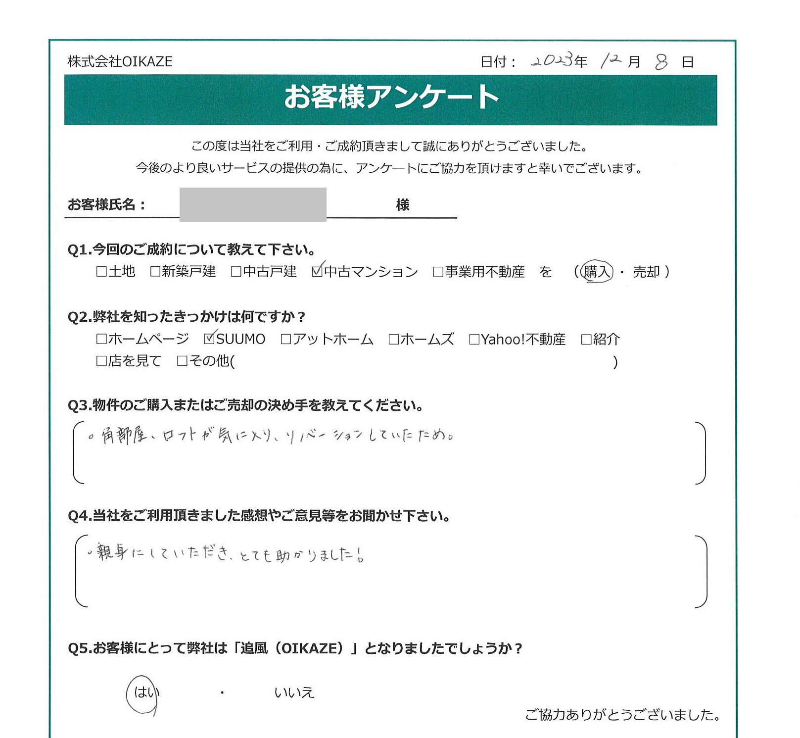 【2023年12月ご成約】埼玉県川越市の中古マンションをご購入のH様 2023.12.09中古マンション 【2023年12月ご成約】埼玉県川越市の中古マンションをご購入のH様 お客様から頂いたアンケート 今回のご成約について教えてください。 中古マンションを購入。 弊社を知ったきっかけは何ですか? SUUMO。 物件のご売却の決め手を教えて下さい。 角部屋、ロフトが気に入り、リノベーションしていたため。 当社をご利用頂きました感想やご意見等をお聞かせください。 親身にしていただき、とても助かりました! お客様にとって弊社は「追風(OIKAZE)」となりましたでしょうか? はい。