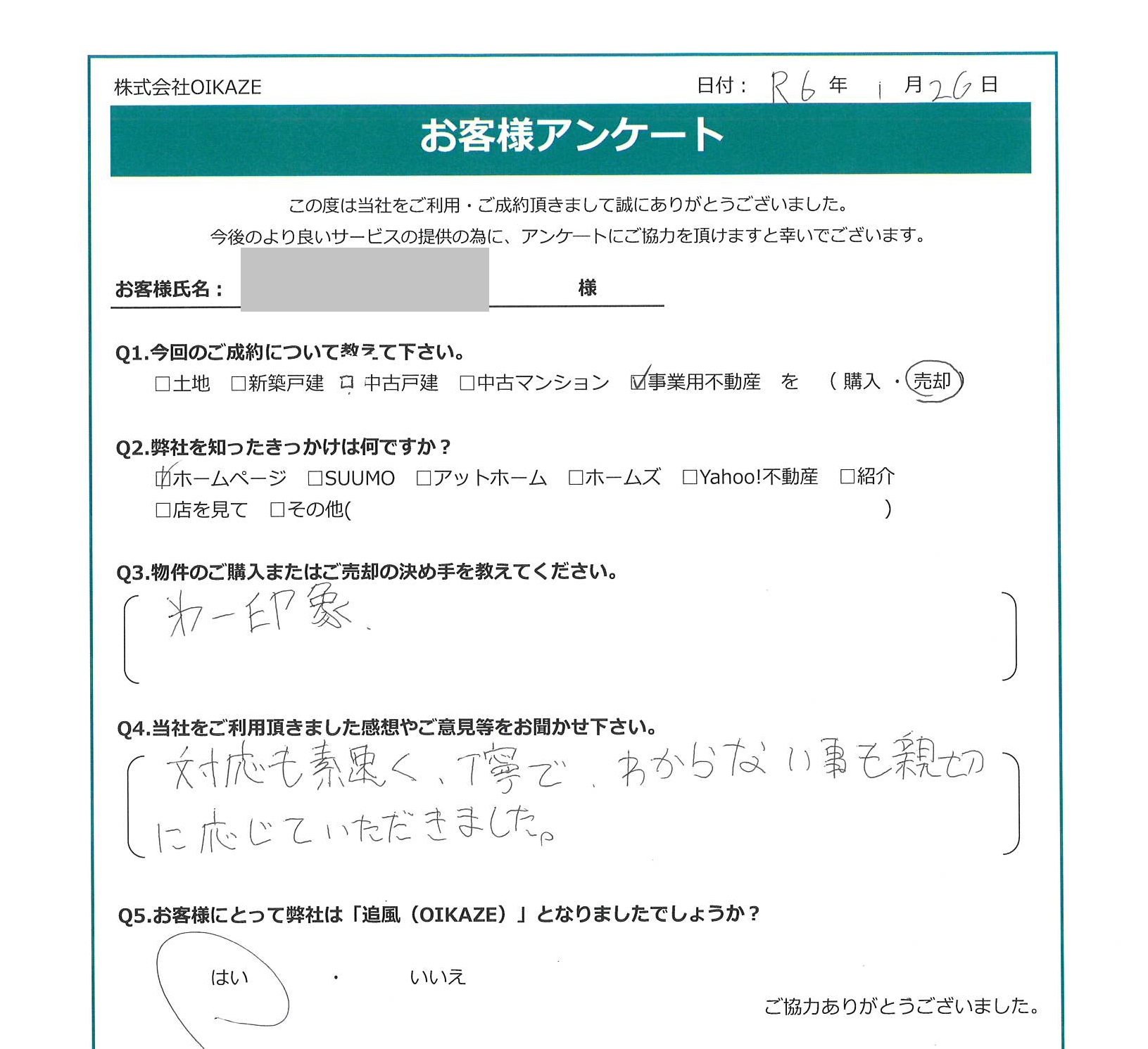 【2024年1月ご成約】埼玉県川越市の事業用不動産(駐車場用地)をご売却のO様 2024.01.26事業用不動産, 渡辺健太 【2024年1月ご成約】埼玉県川越市の事業用不動産(駐車場用地)をご売却のO様 お客様から頂いたアンケート 今回のご成約について教えてください土地を売却。弊社を知ったきっかけは何ですか?ホームページ。物件のご購入の決め手を教えて下さい。第一印象。当社をご利用頂きました感想やご意見等をお聞かせください。対応も素早く、丁寧でわからない事も親切に応じていただきました。お客様にとって弊社は「追風(OIKAZE)」となりましたでしょうか?はい。