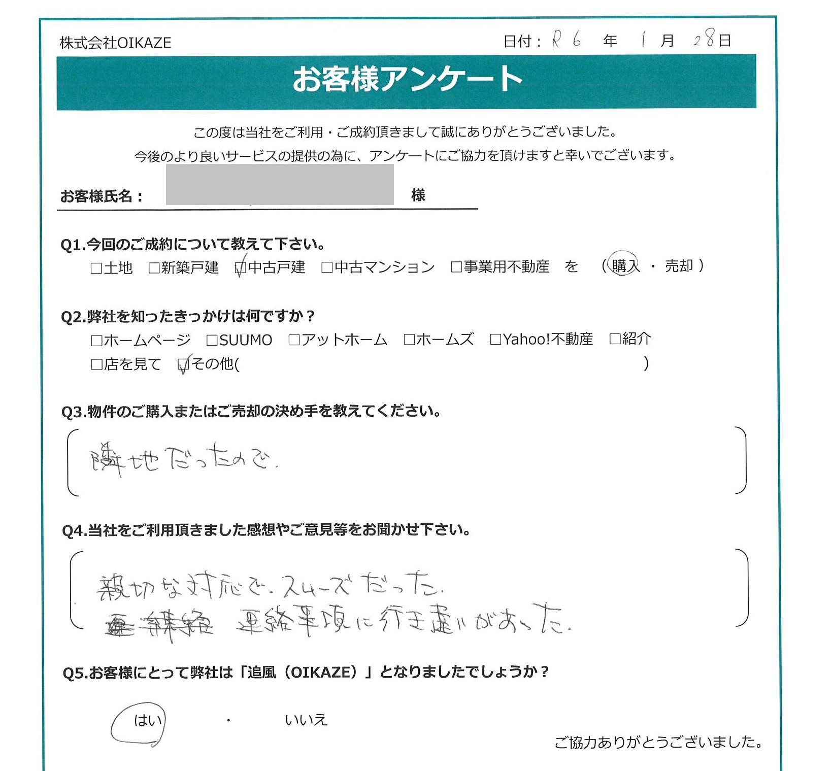 【2024年1月ご成約】埼玉県狭山市の中古戸建をご購入のT様2024.01.28中古戸建, 渡辺健太 【2024年1月ご成約】埼玉県狭山市の中古戸建をご購入のT様 お客様から頂いたアンケート 今回のご成約について教えてください中古戸建を購入。弊社を知ったきっかけは何ですか?その他。物件のご購入の決め手を教えて下さい。隣地だったので。当社をご利用頂きました感想やご意見等をお聞かせください。親切な対応で、スムーズだった。連絡事項に行き違いがあった。お客様にとって弊社は「追風(OIKAZE)」となれたでしょうか?はい。