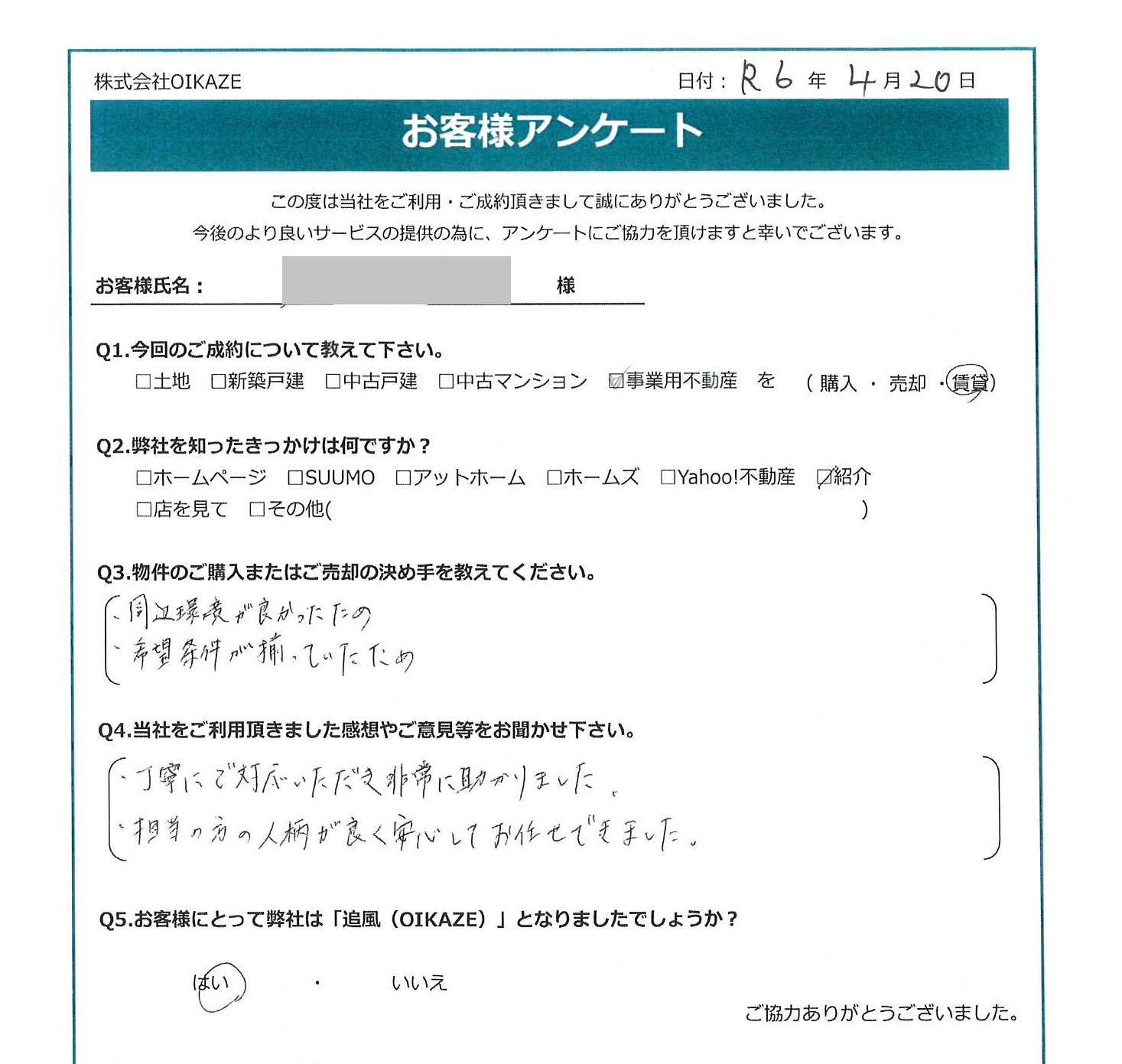 【2024年4月ご成約】埼玉県川越市の事業用不動産(事務所)を賃貸のG様 2024.04.22事業用不動産 【2024年4月ご成約】埼玉県川越市の事業用不動産(事務所)を賃貸のG様 お客様から頂いたアンケート 今回のご成約について教えてください事業用不動産を賃貸。弊社を知ったきっかけは何ですか?紹介。物件の決め手を教えて下さい。周辺環境が良かったため。希望条件が揃っていたため当社をご利用頂きました感想やご意見等をお聞かせください。丁寧にご対応いただき非常に助かりました。担当の方の人柄が良く安心してお任せできました。お客様にとって弊社は「追風(OIKAZE)」となりましたでしょうか?はい。