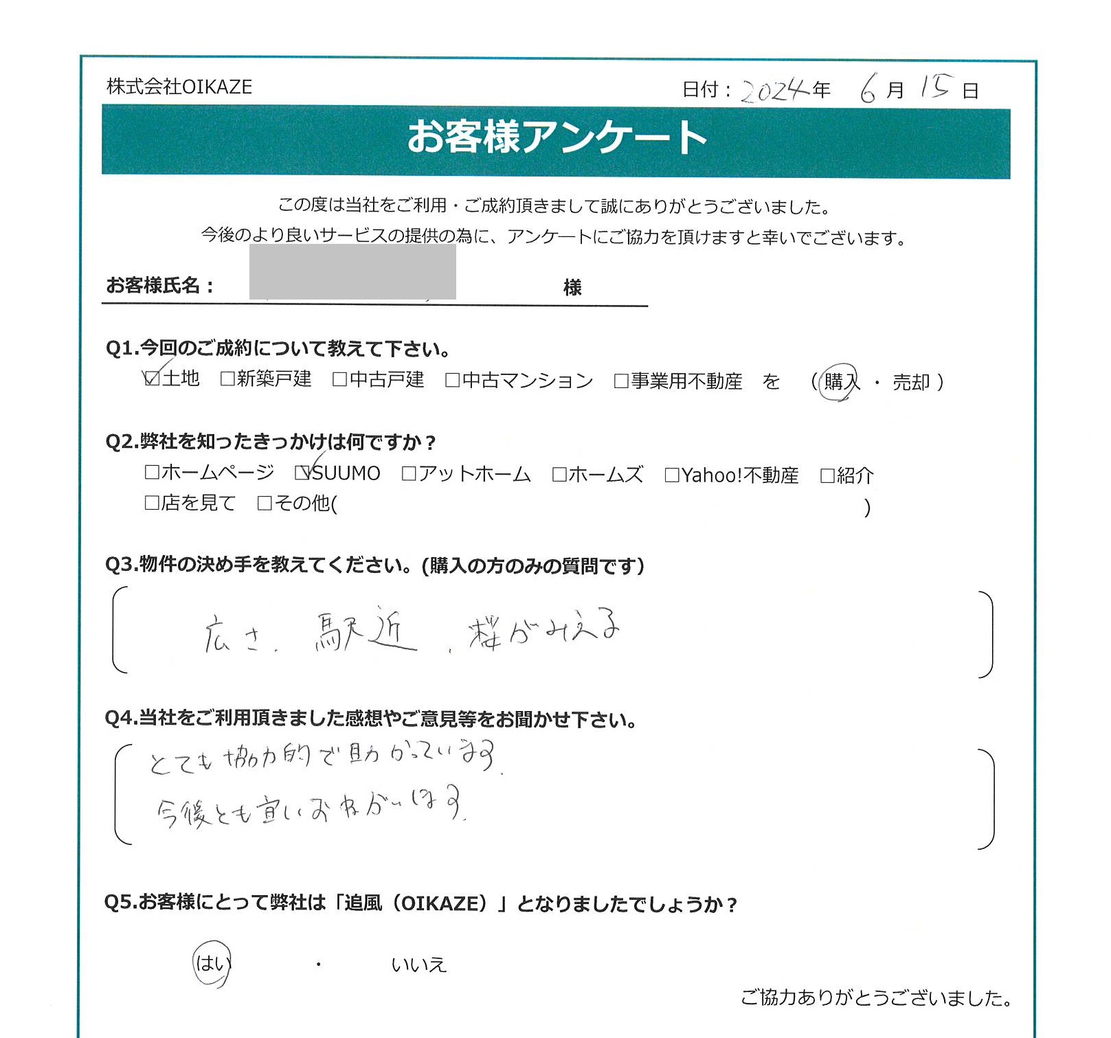【2024年6月ご成約】埼玉県富士見市の土地をご購入のU様2024.06.16土地 【2024年6月ご成約】埼玉県富士見市の土地をご購入のU様 お客様から頂いたアンケート 今回のご成約について教えてください土地を購入。弊社を知ったきっかけは何ですか?SUUMO。物件のご購入の決め手を教えて下さい。広さ。駅近。桜がみえる。当社をご利用頂きました感想やご意見等をお聞かせください。とても協力的で助かっています。今後とも宜しくおねがいします。お客様にとって弊社は「追風(OIKAZE)」となれたでしょうか?はい。