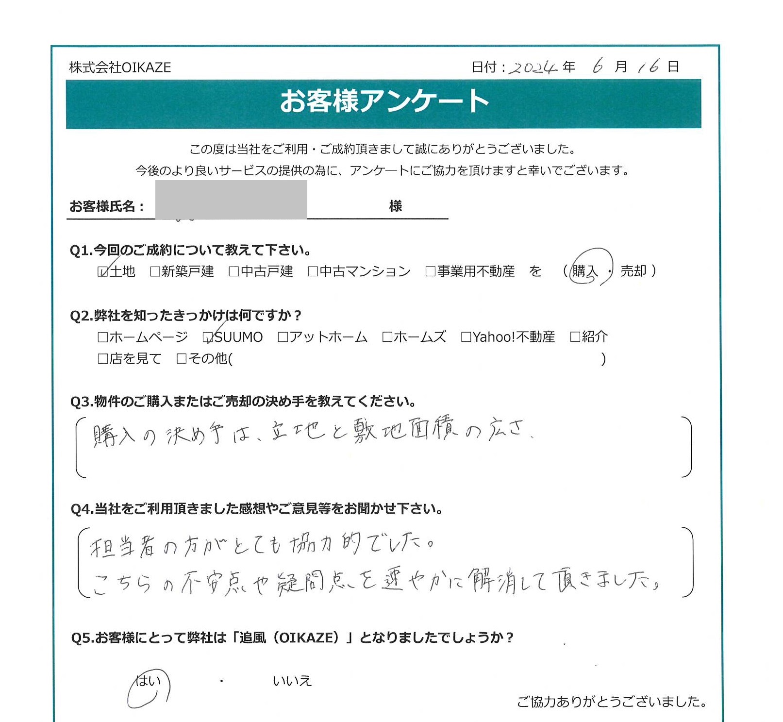 【2024年6月ご成約】埼玉県川越市の土地をご購入のS様2024.06.16土地, 前田悠太 【2024年6月ご成約】埼玉県川越市の土地をご購入のS様oppo_1026 お客様から頂いたアンケート 今回のご成約について教えてください土地を購入。弊社を知ったきっかけは何ですか?SUUMO。物件のご購入の決め手を教えて下さい。購入の決め手は、立地と敷地面積の広さ。当社をご利用頂きました感想やご意見等をお聞かせください。担当者の方がとても協力的でした。こちらの不安点や疑問点を速やかに解消して頂きました。お客様にとって弊社は「追風(OIKAZE)」となれたでしょうか?はい。