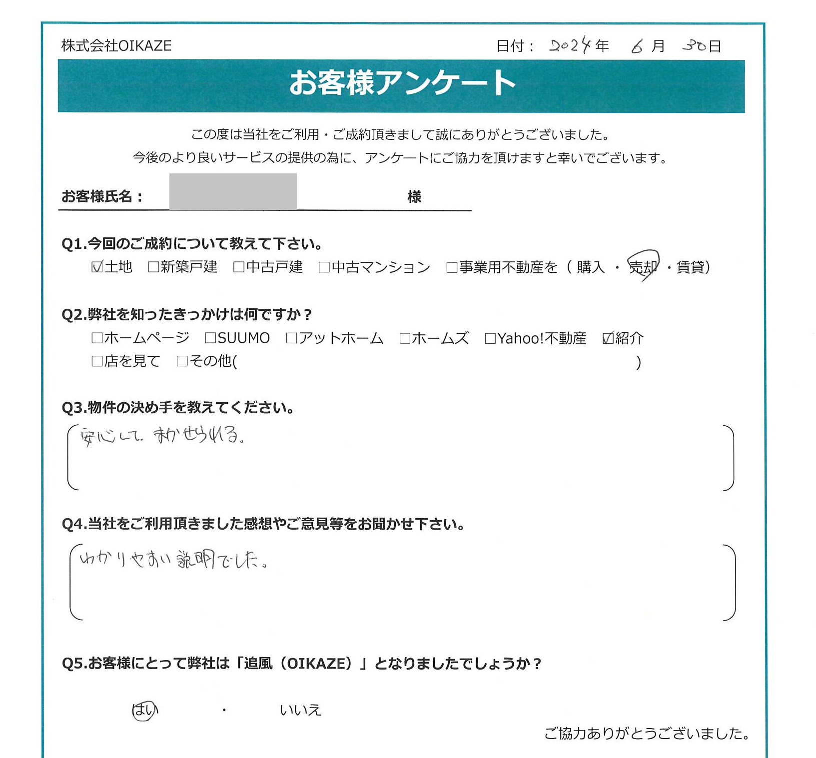 【2024年6月ご成約】埼玉県川越市の土地をご売却のK様2024.06.30土地 【2024年6月ご成約】埼玉県川越市の土地をご売却のK様 お客様から頂いたアンケート 今回のご成約について教えてください土地を売却。弊社を知ったきっかけは何ですか?安心して、まかせられる。当社をご利用頂きました感想やご意見等をお聞かせくださいわかりやすい説明でした。お客様にとって弊社は「追風(OIKAZE)」となりましたでしょうか?はい