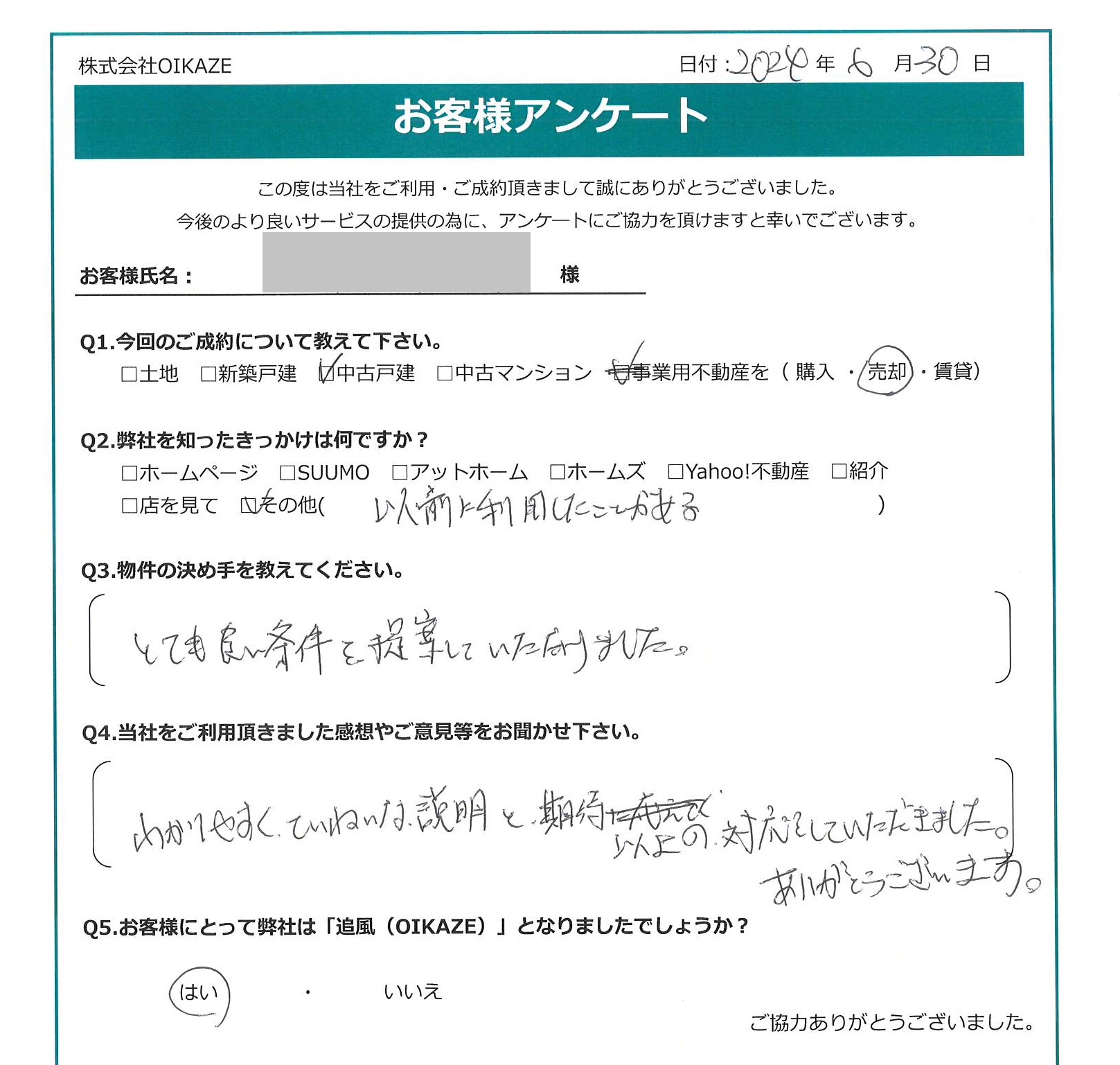 【2024年6月ご成約】埼玉県川越市の中古戸建をご売却のK様 2024.07.01中古戸建 【2024年6月ご成約】埼玉県川越市の中古戸建をご売却のK様 oppo_1026 お客様から頂いたアンケート 今回のご成約について教えてください中古戸建を売却。弊社を知ったきっかけは何ですか?以前に利用したことがある。物件のご売却の決め手を教えてください。とても良い条件を提案していただけました。当社をご利用頂きました感想やご意見等をお聞かせください。わかりやすく、ていねいな説明と期待以上の対応をしていただきました。ありがとうございます。お客様にとって弊社は「追風(OIKAZE)」となりましたでしょうか?はい。
