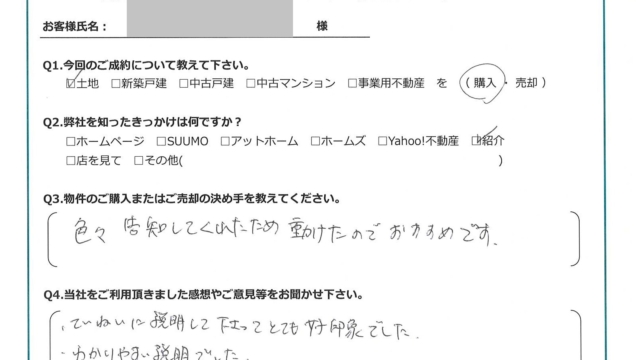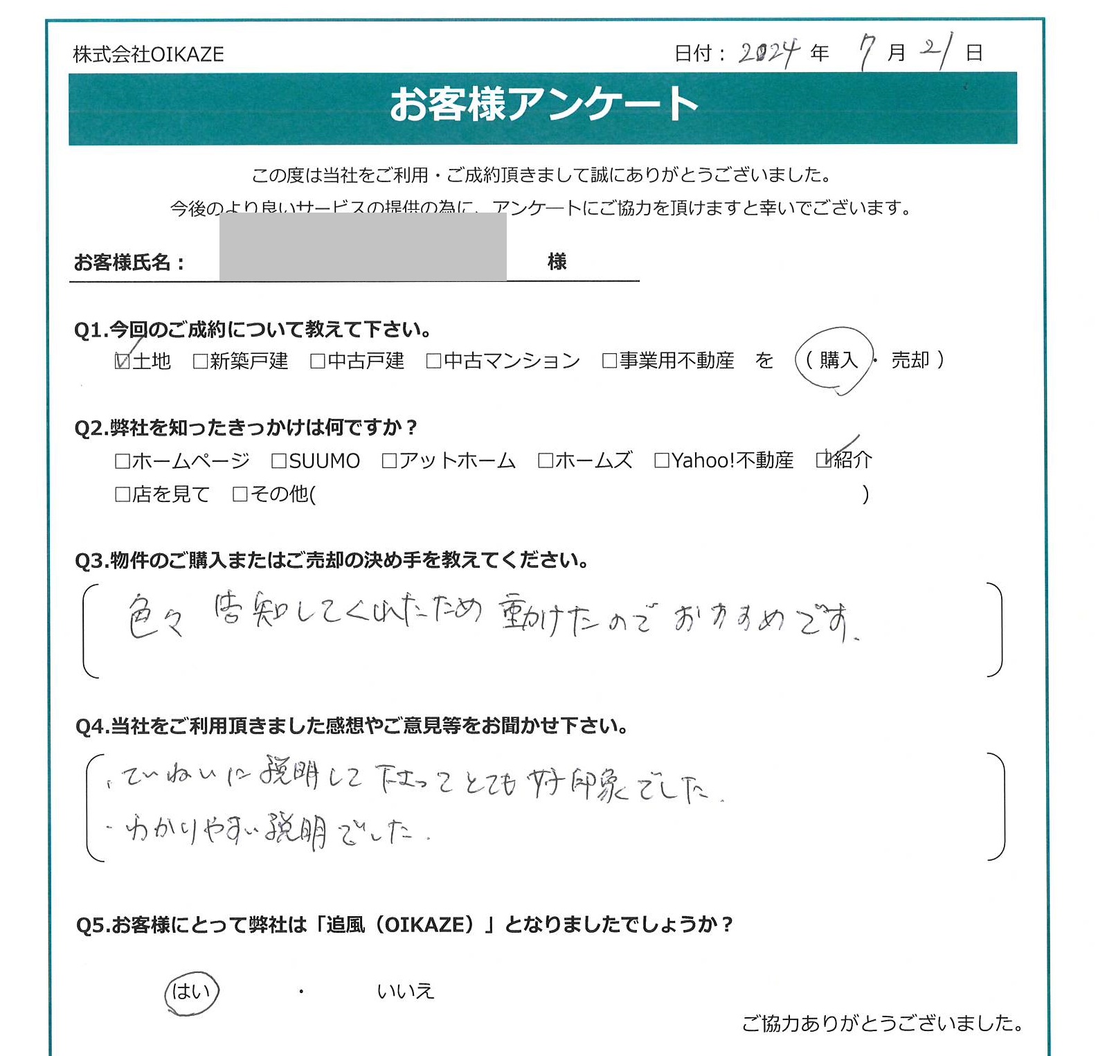 【2024年7月ご成約】埼玉県川越市の土地をご購入のK様2024.07.22土地, 前田悠太 【2024年7月ご成約】埼玉県川越市の土地をご売却のK様oppo_1026 c52fd41f2efc425321bf37f0b4a4fe96-2 今回のご成約について教えてください土地を購入。弊社を知ったきっかけは何ですか?紹介。物件のご購入の決め手を教えて下さい。色々告知してくれたため 動けたのでおすすめです。当社をご利用頂きました感想やご意見等をお聞かせください。ていねいに説明して下さってとても好印象でした。わかりやすい説明でした。お客様にとって弊社は「追風(OIKAZE)」となれたでしょうか?はい。