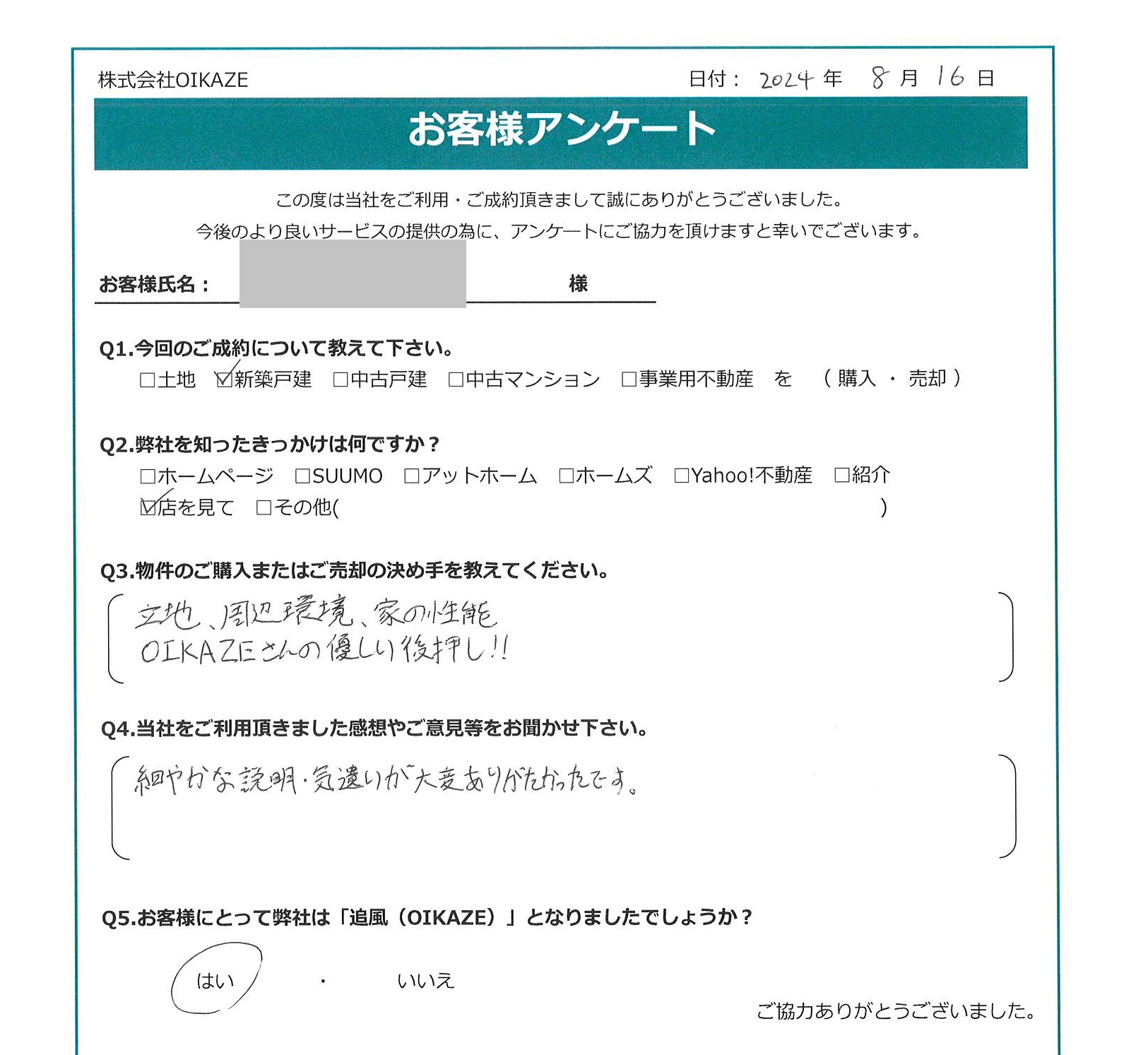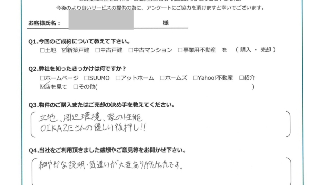 【2024年8月ご成約】埼玉県川越市の新築戸建をご購入のT様2024.08.17新築戸建 IMG_6350 トリミング完成20240817_114302_0001 今回のご成約について教えてください。新築戸建を購入。弊社を知ったきっかけは何ですか?店を見て物件のご購入の決め手を教えて下さい。立地、周辺環境、家の性能・OIKAZEさんの優しい後押し!!当社をご利用頂きました感想やご意見等をお聞かせください。細やかな説明・気遣いが大変ありがたかったです。お客様にとって弊社は「追風(OIKAZE)」となりましたでしょうか?はい