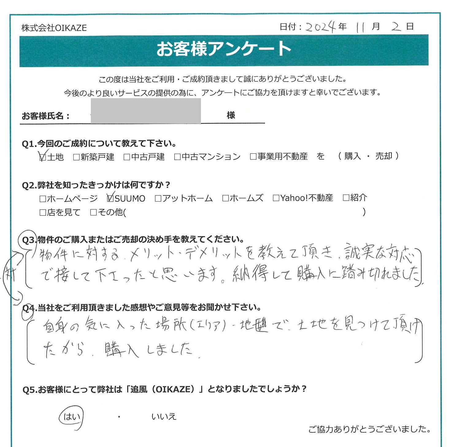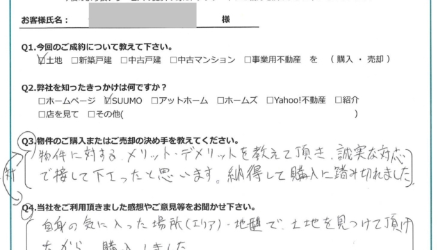 【2024年11月ご成約】埼玉県川越市の土地をご購入のN様 2024.11.03土地, 渡辺健太, 前田悠太 顔隠し トリミング済jpg 今回のご成約について教えてください。 土地を購入 弊社を知ったきっかけは何ですか? SUUMO 物件のご購入の決め手を教えてください。 自身の気に入った場所(エリア)・地形で土地を見つけていただけたから購入しました。 当社をご利用頂きました感想やご意見等をお聞かせ下さい。 物件に対するメリット・デメリットを教えて頂き、誠実な対応で接して下さったと思います。納得して購入に踏み切れました。 お客様にとって弊社は「追風(OIKAZE)となりましたでしょうか? はい。 担当はこんな人!