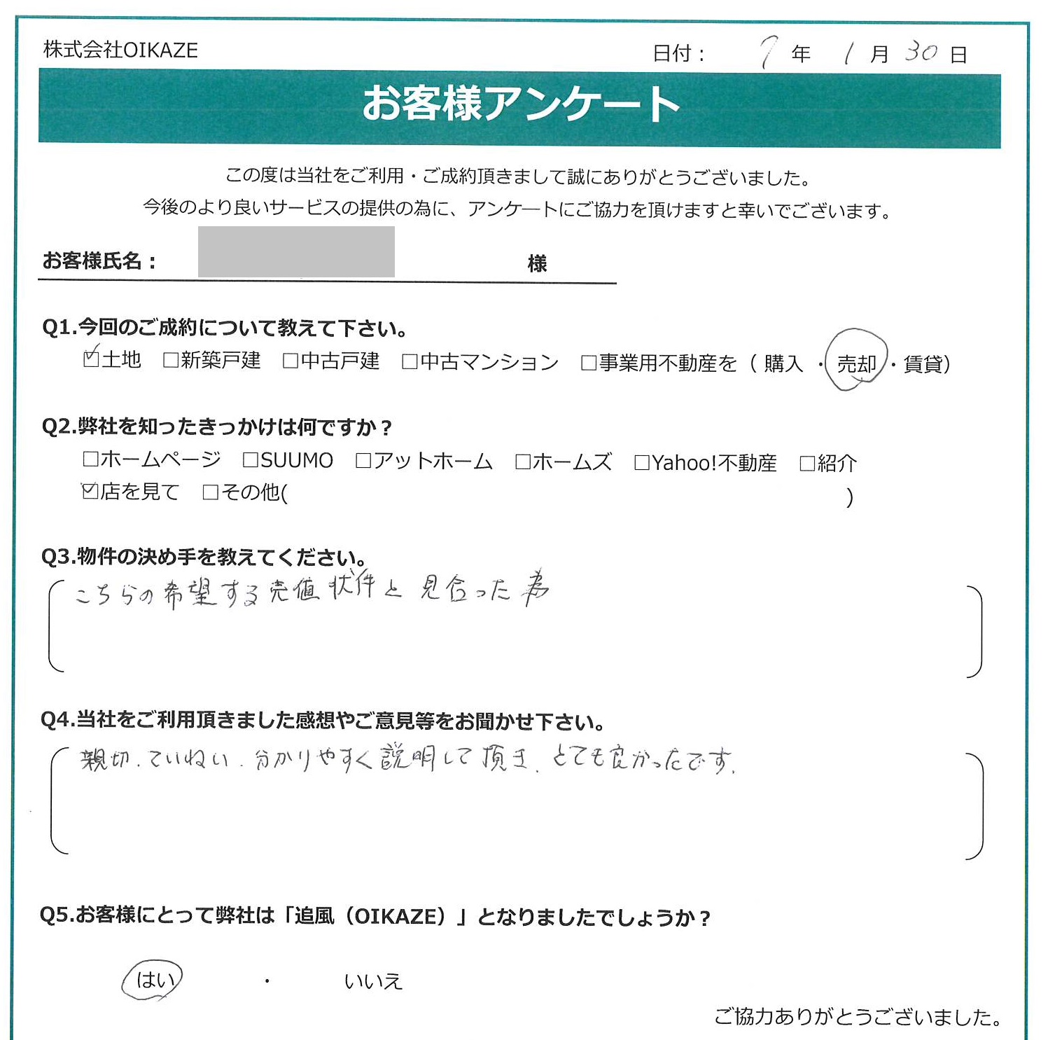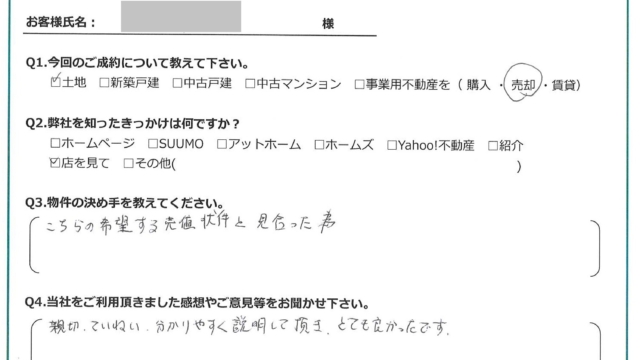 【2025年1月ご成約】埼玉県ふじみ野市の土地をご売却のS様2025.01.31土地, 渡辺健太, 立柳佑基 【2025年1月ご成約】埼玉県ふじみ野市の土地をご売却のS様 トリミング済 今回のご成約について教えて下さい。土地を売却。弊社を知ったきっかけは何ですか?店を見て。物件の決め手を教えて下さい。こちらの希望する売値条件と見合った為。当社をご利用頂きました感想やご意見等をお聞かせ下さい。親切、ていねい、分かりやすく説明して頂きとても良かったです。お客様にとって弊社は「追風(OIKAZE)」となりましたでしょうか?はい。