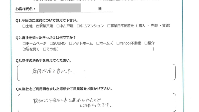 【2025年2月ご成約】埼玉県川越市の新築戸建をご購入のA様2025.02.10新築戸建 2025年2月ご成約】埼玉県川越市の新築戸建をご購入のA様 トリミング済 今回のご成約について教えて下さい。新築戸建を購入。弊社を知ったきっかけは何ですか?店を見て。物件の決め手を教えてください。条件が全て良かった。当社をご利用頂きました感想やご意見等をお聞かせ下さい。親切で、不安なく事を進められたのでとても良かったです。お客様にとって弊社は「追風(OIKAZE)」となりましたでしょうか?はい。