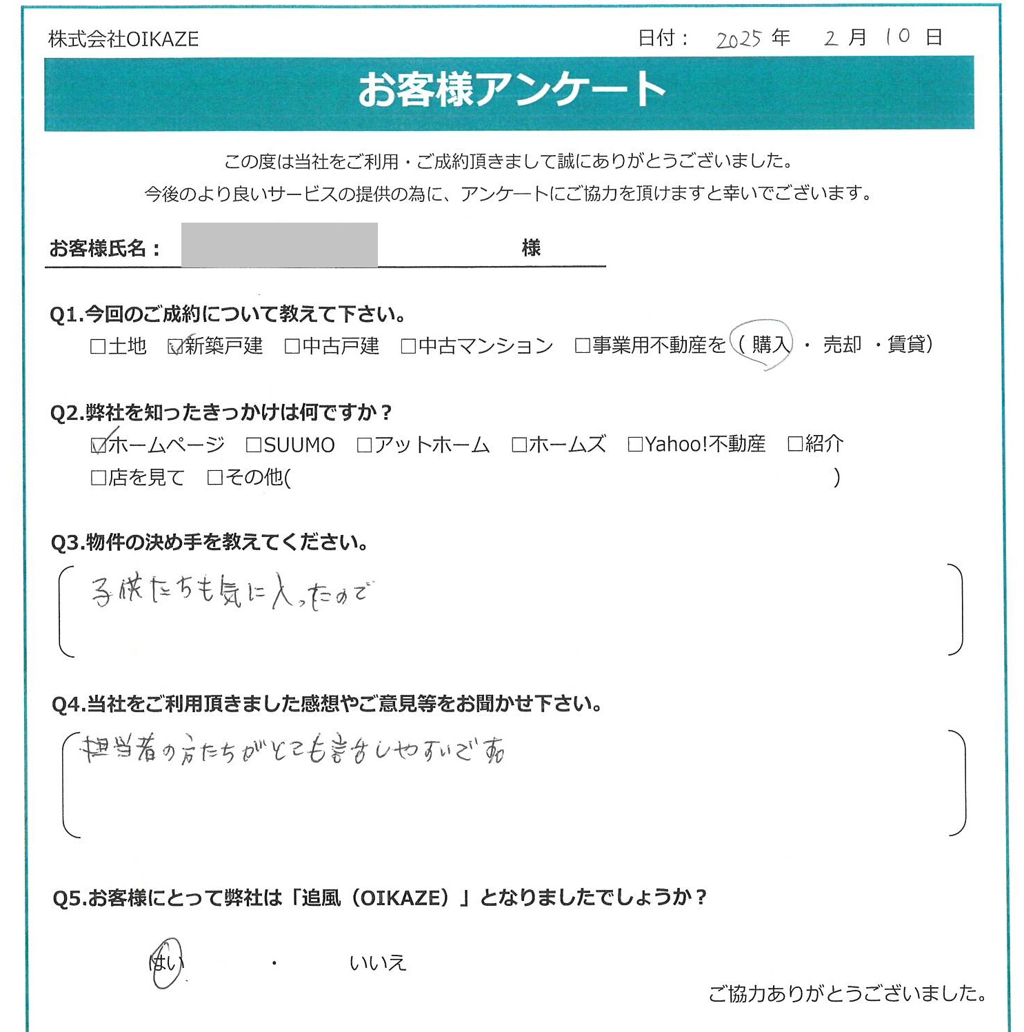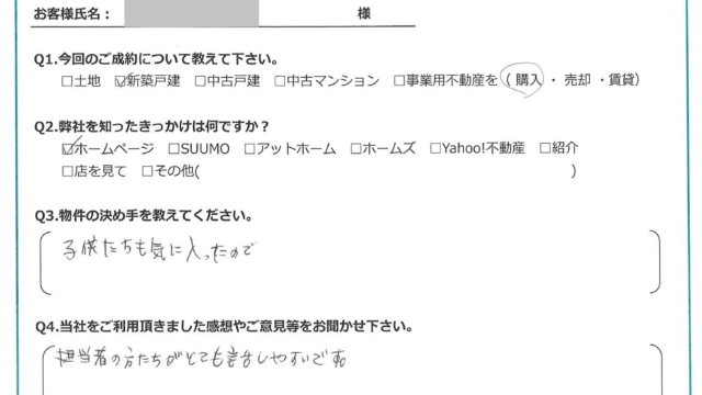 【2025年2月ご成約】埼玉県ふじみ野市の新築戸建をご購入のI様2025.02.15新築戸建 【2025年2月ご成約】埼玉県ふじみ野市の新築戸建をご購入のI様 トリミング済 今回のご成約について教えて下さい。新築戸建を購入。弊社を知ったきっかけは何ですかホームページ。物件の決め手を教えて下さい。子供たちも気に入ったので。当社をご利用頂きました感想やご意見等をお聞かせください。担当者の方たちがとても話しやすいです。お客様にとって弊社は「追風(OIKAZE)」となりましたでしょうか?はい。