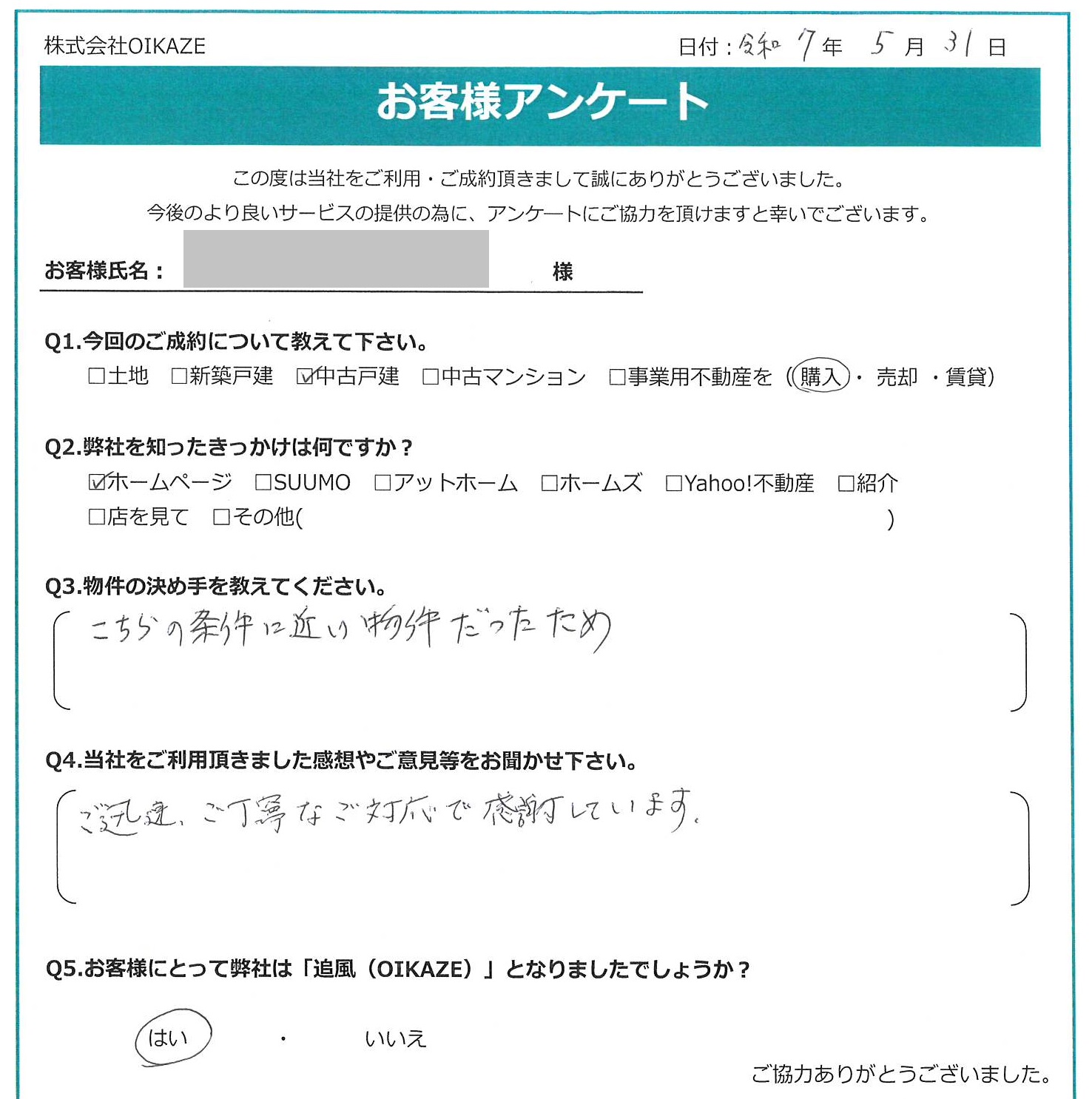 【2025年5月ご成約】埼玉県川越市の中古戸建をご購入のW様2025.05.31中古戸建 トリミング済 お客様から頂いたアンケート 今回のご成約について教えて下さい。中古戸建を購入。弊社を知ったきっかけは何ですか?ホームページ。物件の決め手を教えて下さい。こちらの条件に近い物件だったため。当社をご利用頂きました感想やご意見等をお聞かせ下さい。ご迅速、ご丁寧なご対応で感謝しています。お客様にとって弊社は「追風(OIKAZE)」となりましたでしょうか?はい。