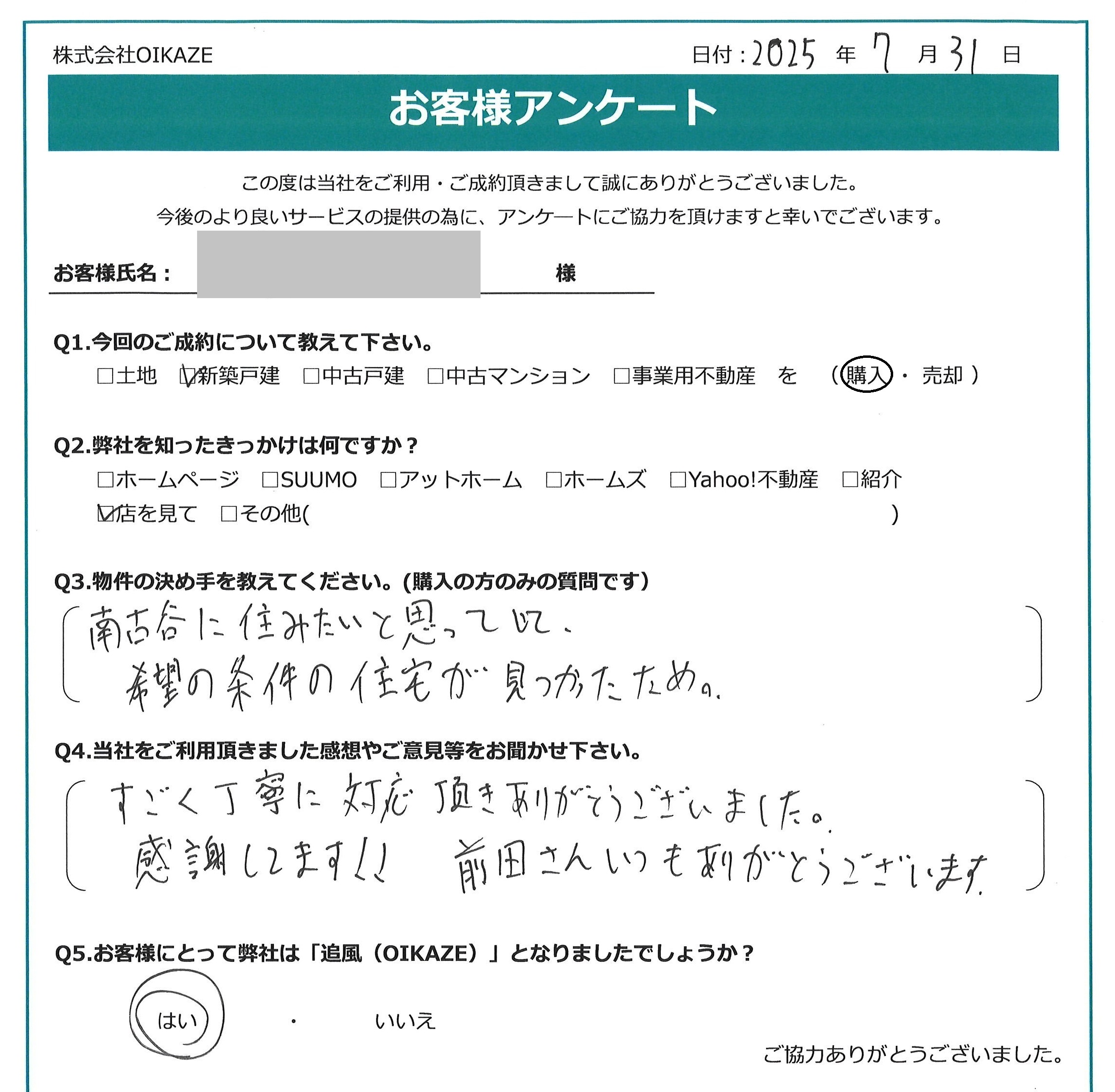 【2025年7月ご成約】埼玉県川越市の新築戸建をご購入のM様2025.07.31新築戸建, 前田悠太 【2025年7月ご成約】埼玉県川越市の新築戸建をご購入のM様 お客様から頂いたアンケート 今回のご成約について教えて下さい。新築戸建をご購入。弊社を知ったきっかけは何ですか?店を見て。物件の決め手を教えて下さい。南古谷に住みたいと思っていて、希望の条件の住宅が見つかったため。当社をご利用頂きました感想やご意見等をお聞かせ下さい。すごく丁寧に対応頂きありがとうございました。感謝してます!!前田さんいつもありがとうございます。お客様にとって弊社は「追風(OIKAZE)」となりましたでしょうか?はい。
