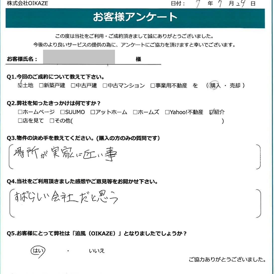【2025年8月ご成約】埼玉県ふじみ野市の土地をご購入のN様2025.09.06土地, 渡辺健太, 前田悠太 【2025年8月ご成約】埼玉県ふじみ野市の土地をご購入のN様 【2025年7月ご成約】埼玉県ふじみ野市の土地をご購入のN様 今回のご成約について教えて下さい。土地を購入。弊社を知ったきっかけは何ですか?紹介。物件の決め手を教えて下さい。場所が実家に近い事。当社をご利用頂きました感想やご意見等をお聞かせ下さい。すばらしい会社だと思う。お客様にとって弊社は「追風(OIKAZE)」となりましたでしょうか?はい。
