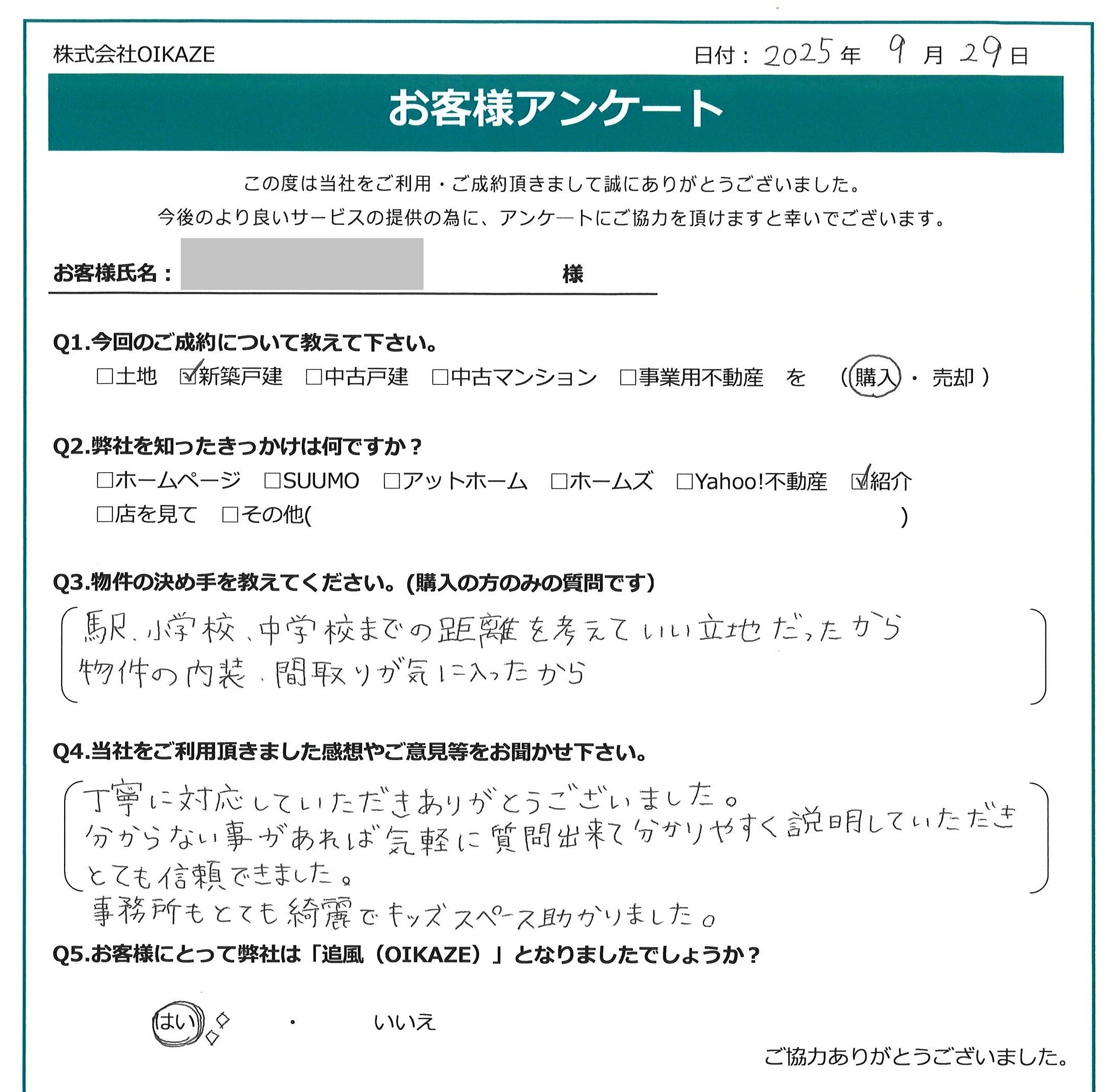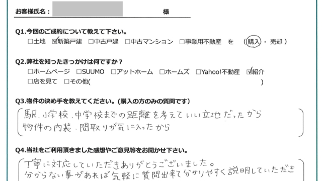 駅、小学校、中学校までの距離を考えていい立地だったから。物件の内装・間取りが気に入ったから。