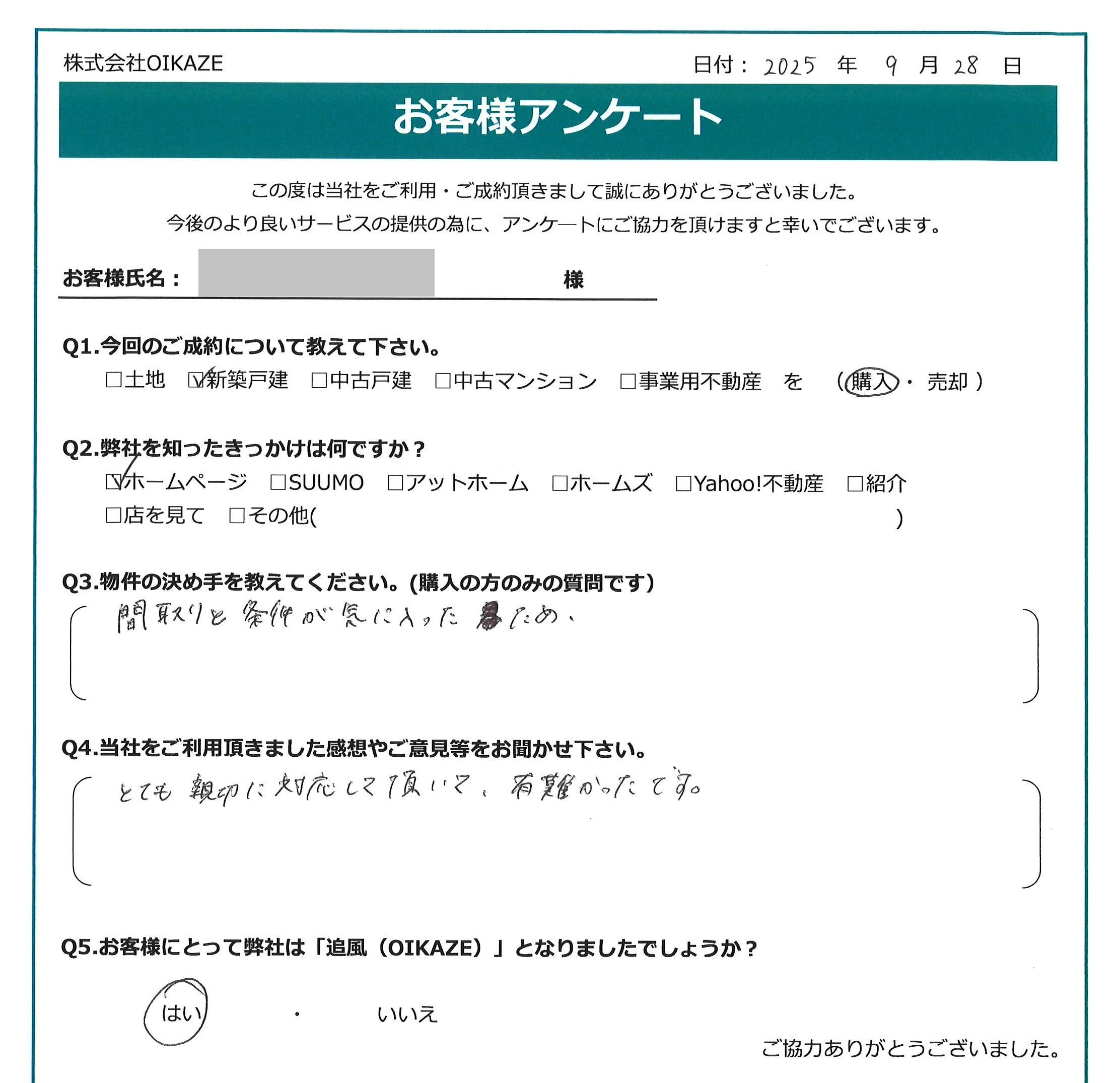 【2025年9月ご成約】埼玉県川越市の新築戸建をご購入のE様2025.10.04新築戸建, 前田悠太 お客様から頂いたアンケート 今回のご成約について教えて下さい。新築戸建を購入。弊社を知ったきっかけは何ですか?ホームページ。物件の決め手を教えて下さい。間取りと条件が気に入ったため。当社をご利用いただきました感想やご意見等をお聞かせください。とても親切に対応して頂いて、有難かったです。お客様にとって弊社は「追風(OIKAZE)」となりましたでしょうか?はい。