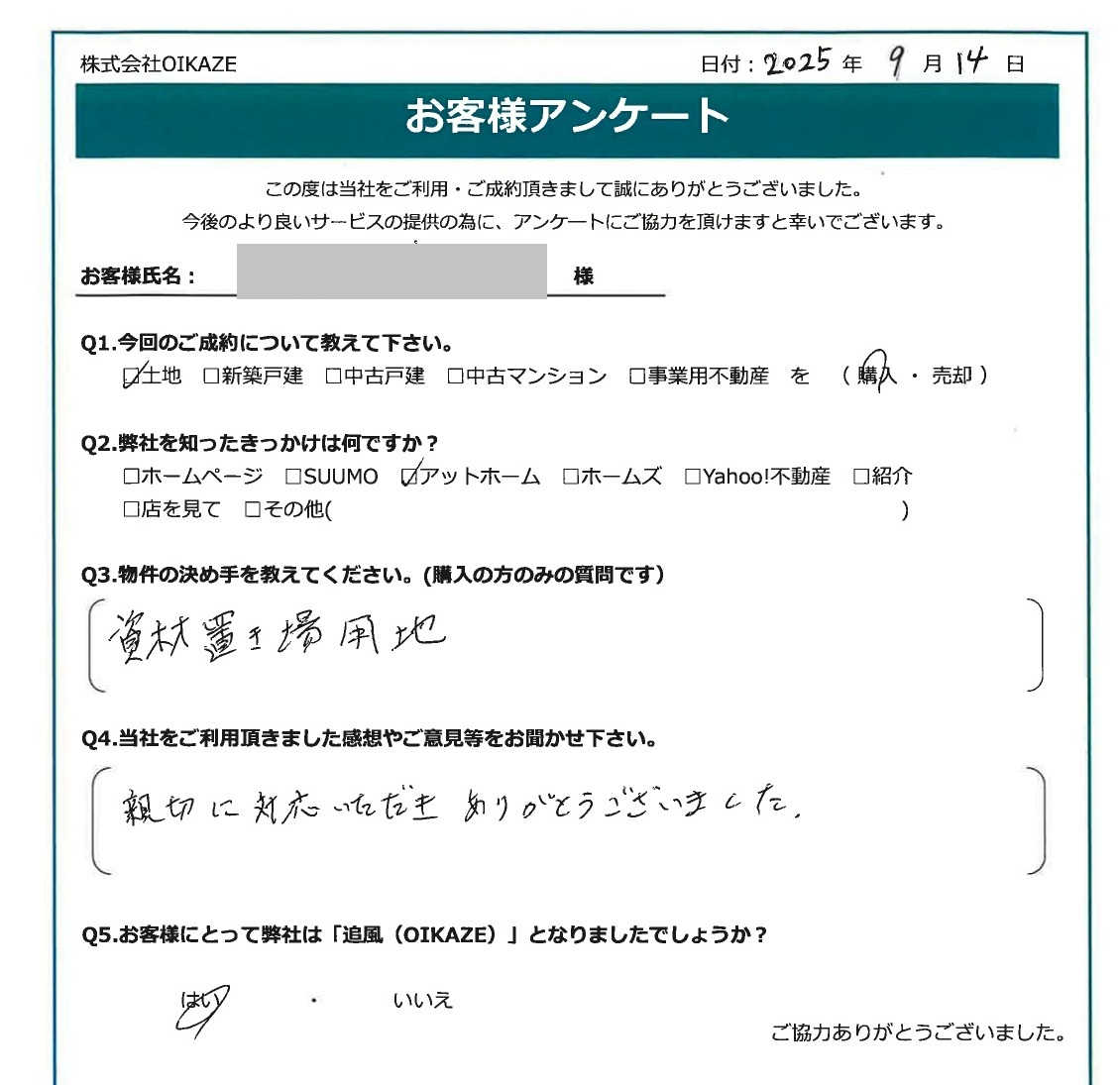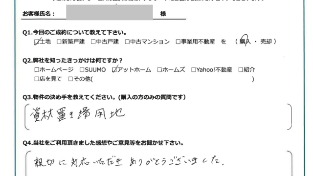 【2025年9月ご成約】埼玉県川越市の土地をご購入のK株式会社様2025.09.14事業用不動産, 武田拓海 oppo_0oppo_0 トリミング済 今回のご成約について教えて下さい。土地を購入。弊社を知ったきっかけは何ですか?アットホーム。物件の決め手を教えて下さい。資材置き場用地。当社をご利用頂きました感想やご意見を等をお聞かせ下さい。親切に対応いただきありがとうございました。お客様にとって弊社は「追風(OIKAZE)」となりましたでしょうか?はい。