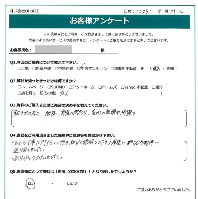 とても丁寧に対応して頂き細かく説明して下さり希望に沿う物件に巡り合えました。ありがとうございました。