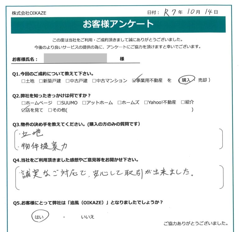 【2025年10月ご成約】埼玉県川越市の事業用不動産をご購入のD株式会社様