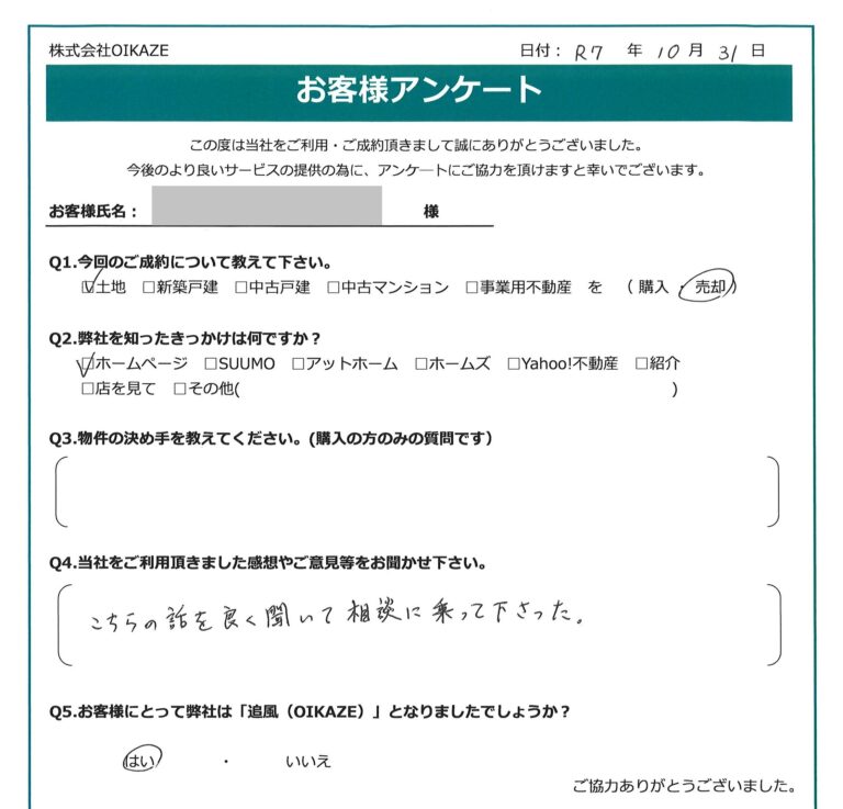 【2025年10月ご成約】埼玉県川越市の土地をご売却のK様