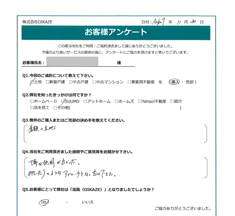 【2025年11月ご成約】埼玉県ふじみ野市の土地をご購入のY様