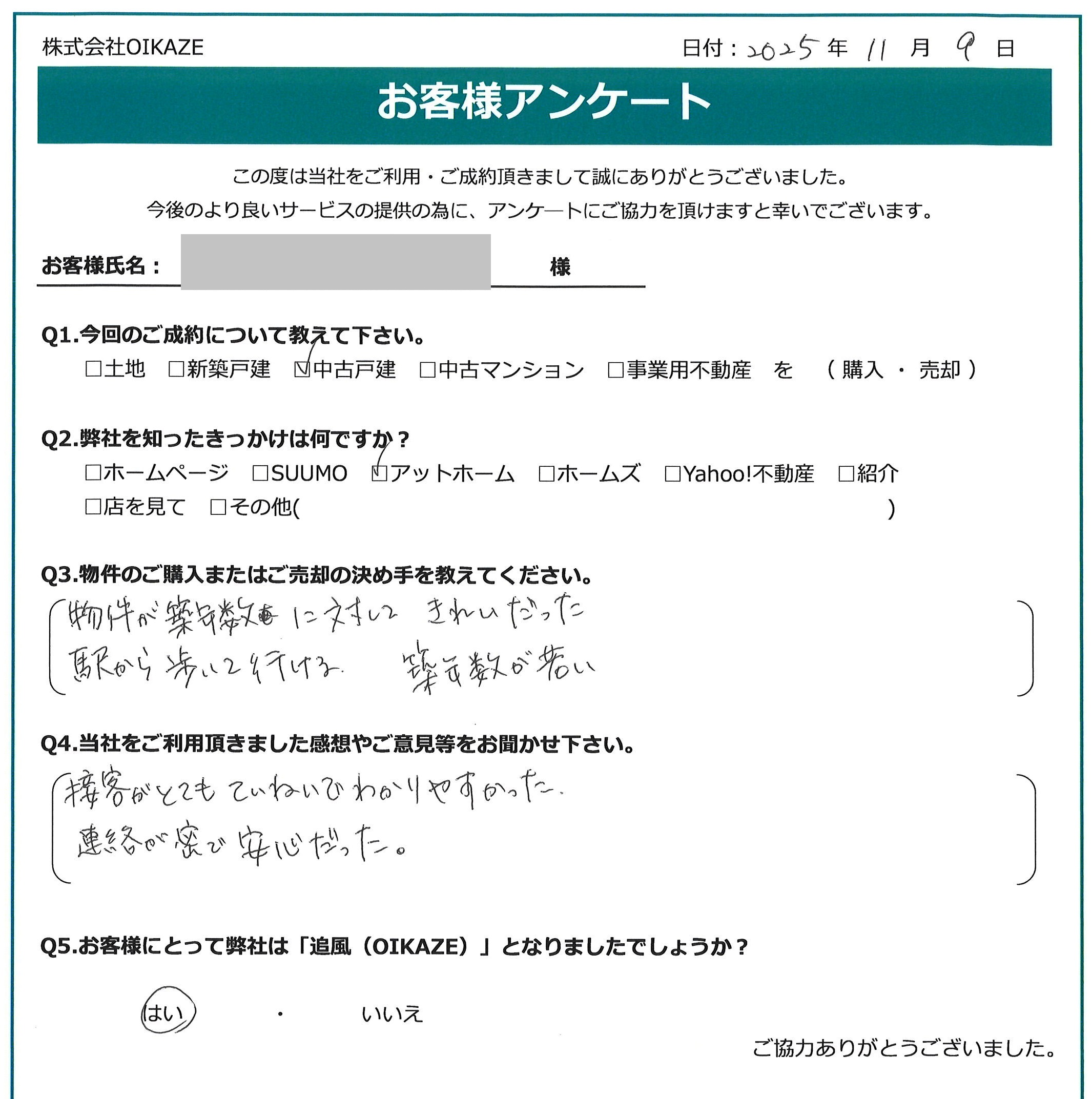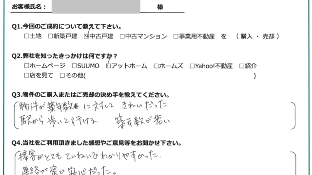 【2025年11月ご成約】埼玉県ふじみ野市の中古戸建をご購入のT様 2025.11.09中古戸建, 武田拓海 【2025年11月ご成約】埼玉県ふじみ野市の中古戸建をご購入のT様oppo_0 トリミング済 今回のご成約について教えて下さい。 中古戸建を購入。 弊社を知ったきっかけは何ですか? アットホーム。 物件のご購入の決め手を教えてください。 物件が築年数に対してきれいだった。 駅から歩いて行ける。 築年数が若い。 当社をご利用頂きました感想やご意見を等をお聞かせください。 接客がとてもていねいでわかりやすかった。 連絡が密で安心だった。 お客様にとって弊社は「追風(OIKAZE)」となりましたでしょうか? はい。 担当はこんな人!