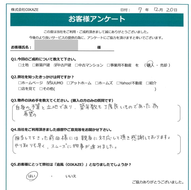 担当して下さった前田様には親身に対応して頂き感謝しております。 やり取りも早く、スムーズに物事が進みました。
