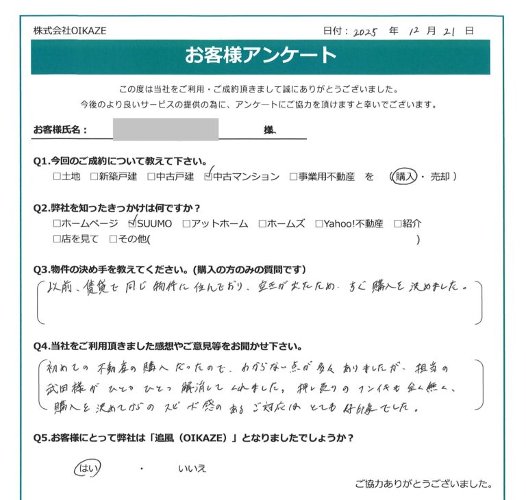 初めての不動産の購入だったので、わからない点が多々ありましたが、担当の武田様がひとつひとつ解消してくれました。押し売りのフンイキも全く無く、購入を決めてからのスピード感のあるご対応はとても好印象でした。