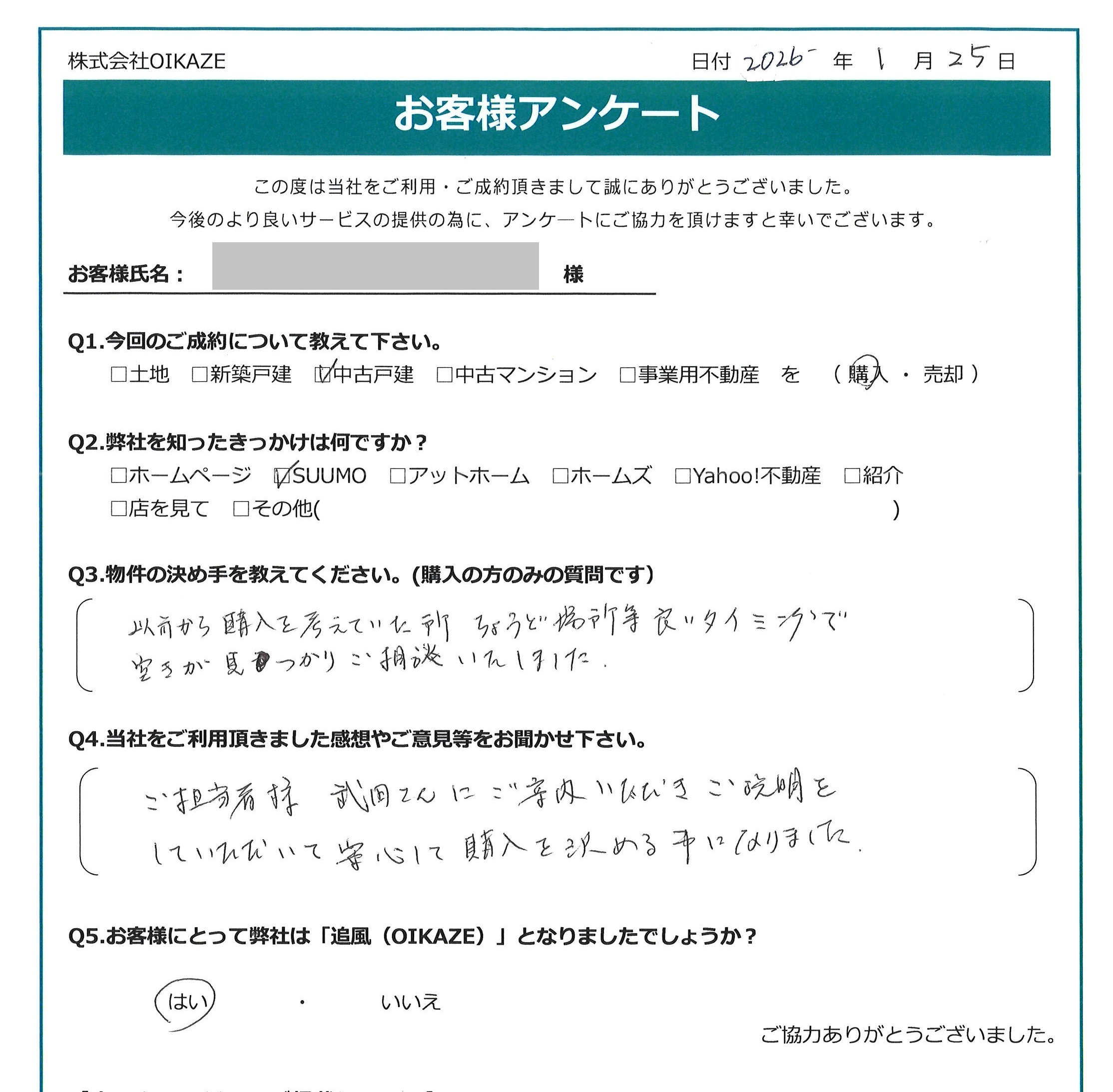 以前から購入を考えていた所、ちょうど場所等良いタイミングで空きが見つかりご相談いたしました。