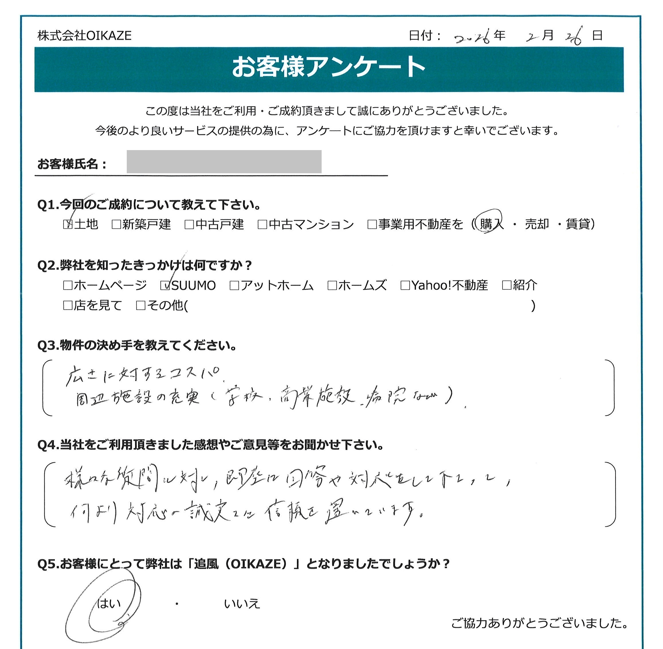 【2026年2月ご成約】埼玉県ふじみ野市の土地をご購入のM様 2026.02.26土地, 立柳佑基 【2026年2月ご成約】埼玉県ふじみ野市の土地をご購入のM様 お客様から頂いたアンケート 今回のご成約について教えて下さい。 土地を購入。 弊社を知ったきっかけは何ですか? SUUMO。 物件の決め手を教えて下さい。 広さに対するコスパ、周辺施設の充実(学校、商業施設、病院など)。 当社をご利用頂きました感想やご意見等をお聞かせ下さい。 様々な質問に対し、即座に回答や対応をして下さって、何より対応の誠実さに信頼を置いています。 お客様にとって弊社は「追風(OIKAZE)」となりましたでしょうか? はい。 担当はこんな人!